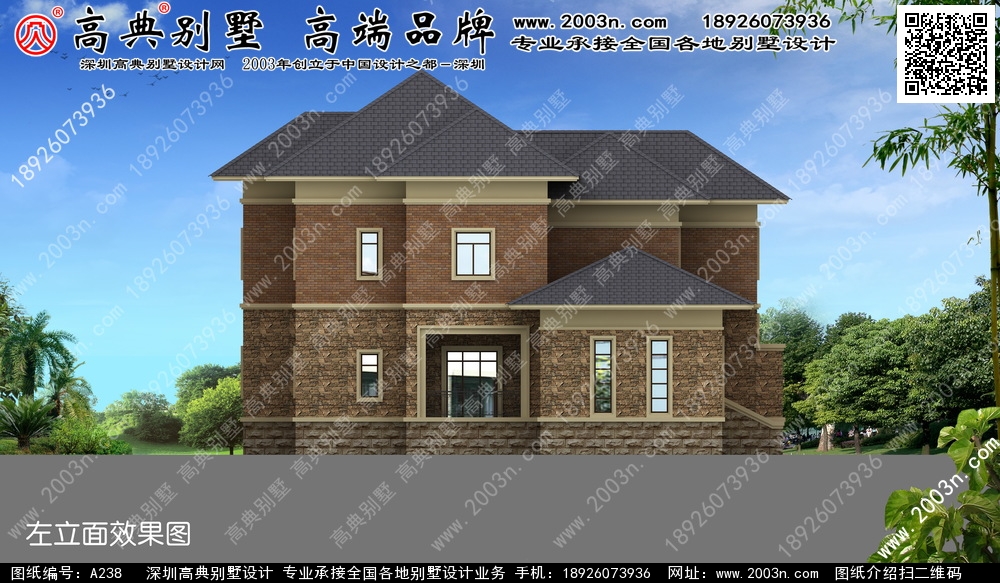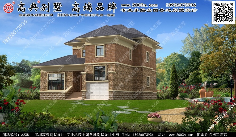 此别墅外墙主要材料: 真石漆、面贴文化石、外墙劈开砖、水泥平板瓦