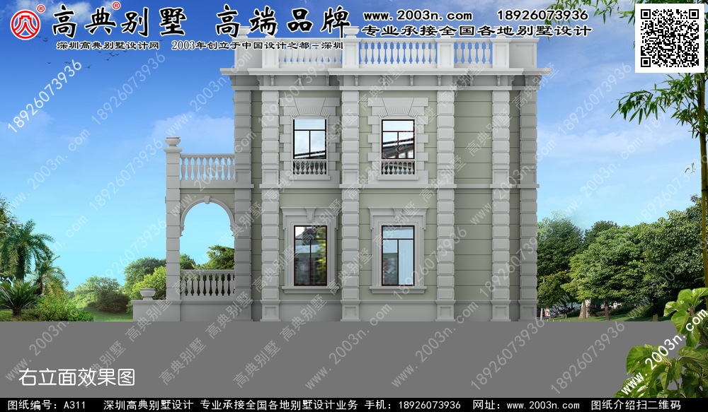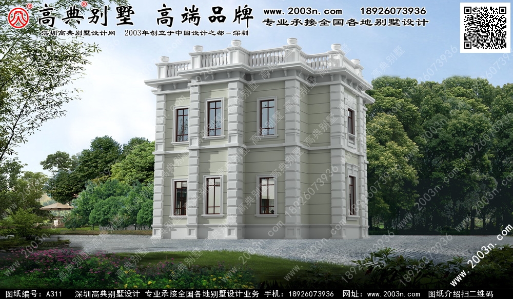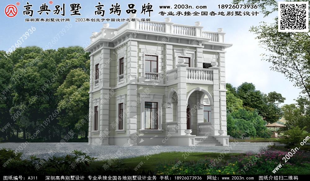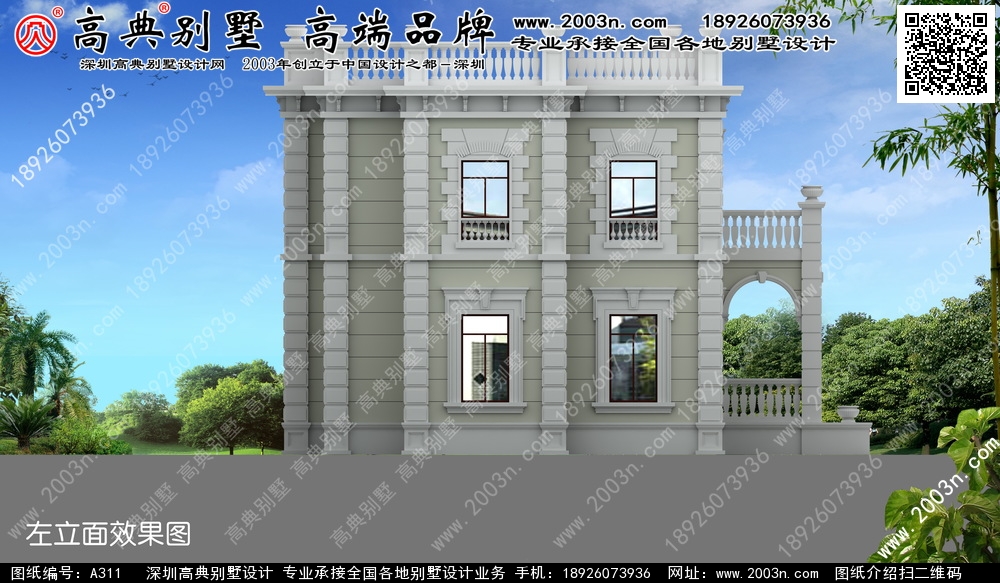 A311号别墅外墙主要材料: 天然岩石漆、水泥构件葫芦柱栏杆、欧式水泥构件线条 |