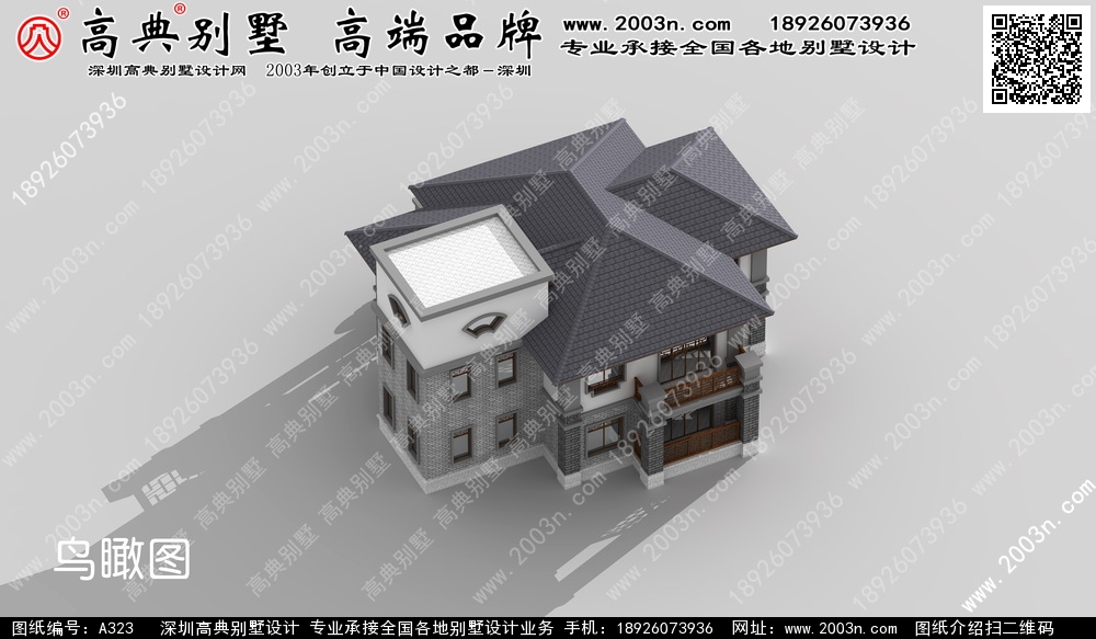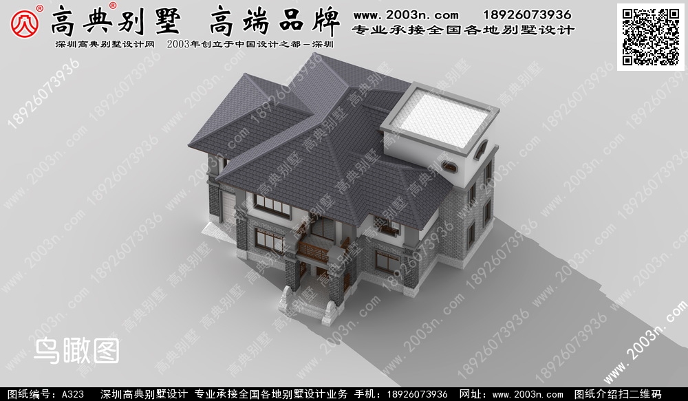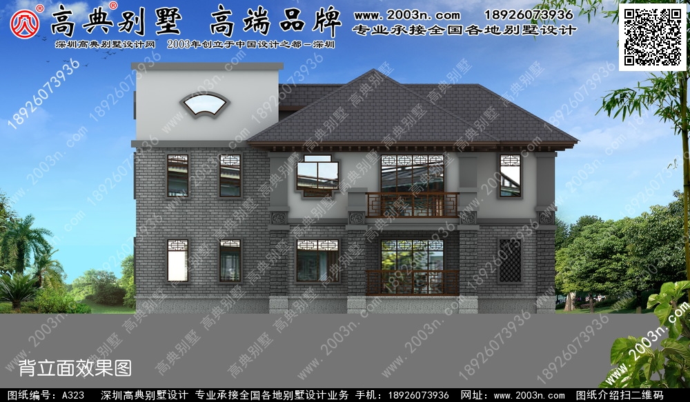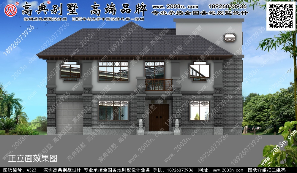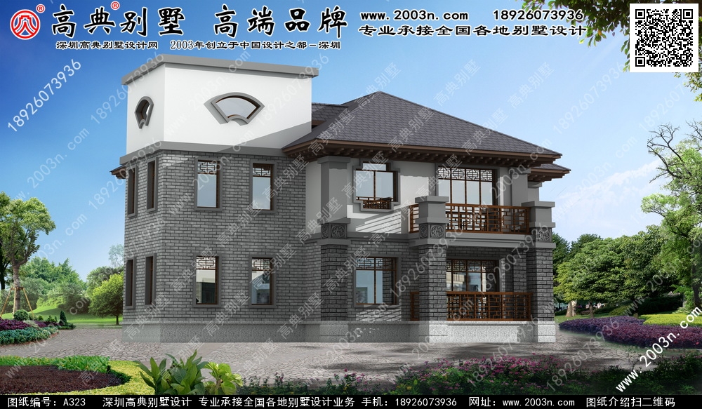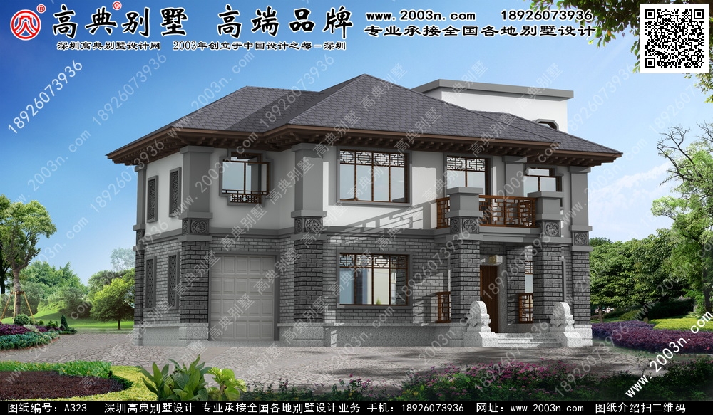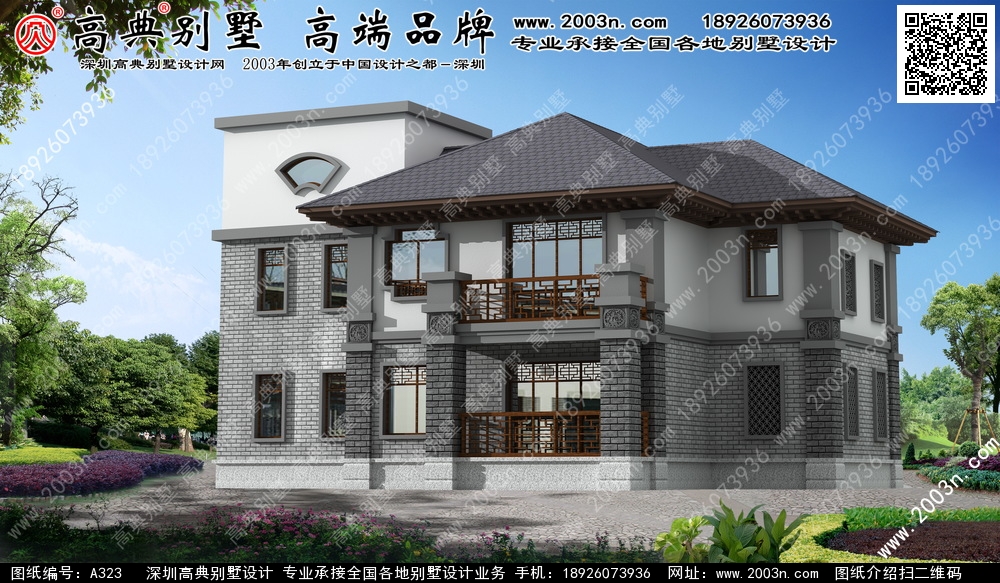 A323号别墅外墙主要材料: 水泥平板瓦、真石漆、仿古青砖、麻石 |