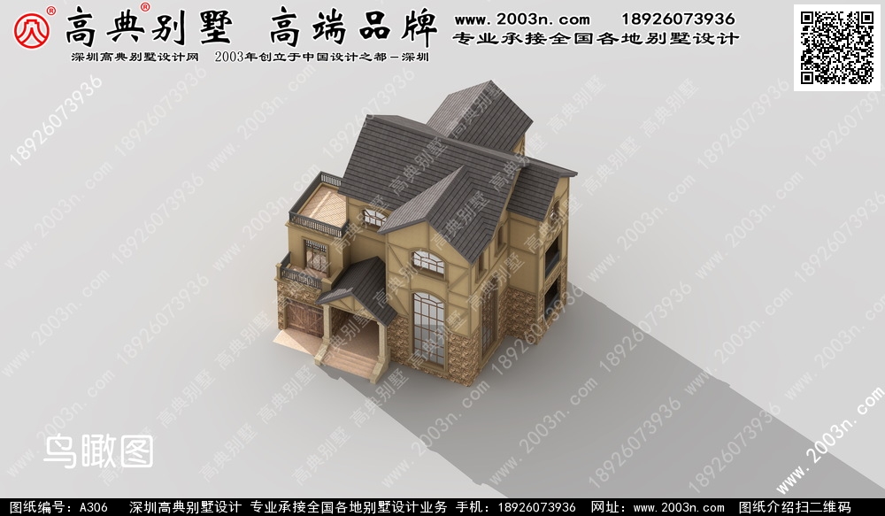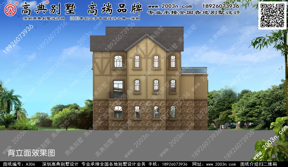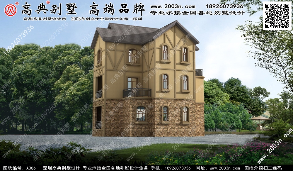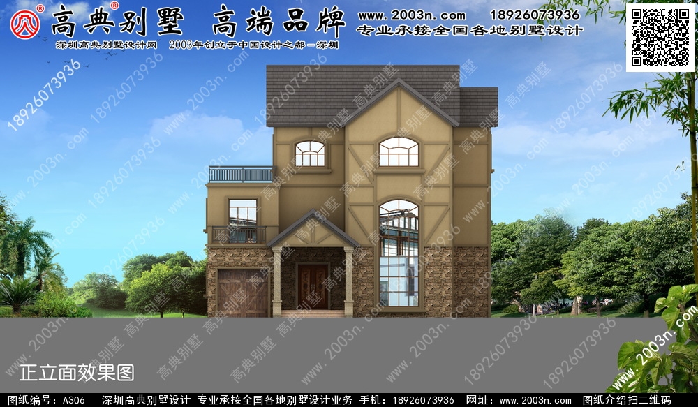 A306号别墅外墙主要材料:真石漆、铁艺栏杆、水泥构件墙面装饰线条、文化石、荔枝面花岗岩、屋面水泥平板瓦 |