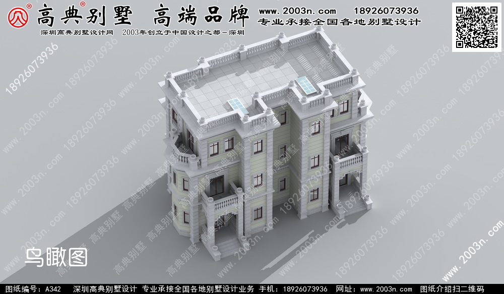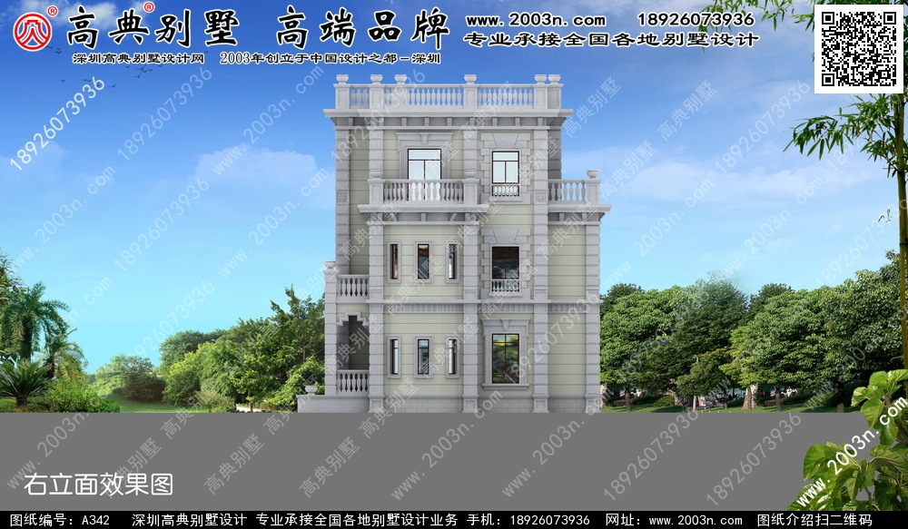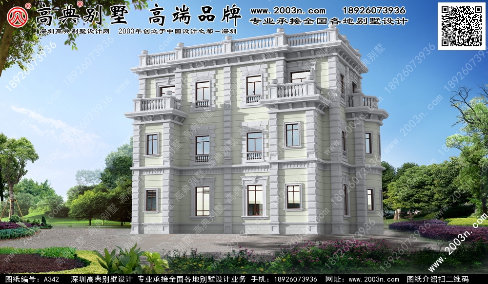A342号别墅外墙主要材料:天然岩石漆、水泥构件葫芦柱栏杆、墙脚白麻石、欧式水泥构件线条 |