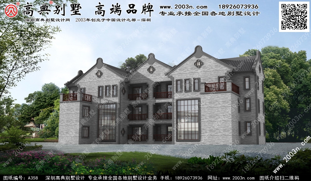 A358号双拼别墅图纸外墙主要材料:仿古青瓦、青灰砖、真石漆 |