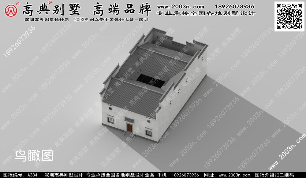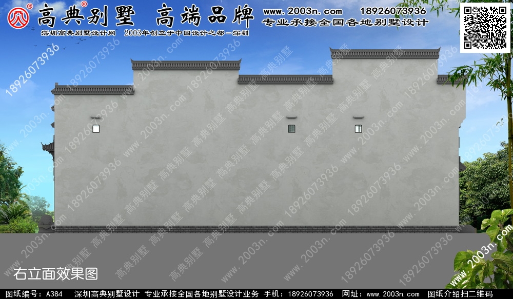 A384号别墅图纸外墙主要材料:真石漆、青砖、屋面仿古筒瓦 |