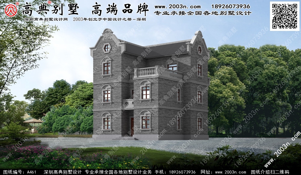 A461号别墅外墙主要材料:天然岩石漆、水泥构件葫芦柱栏杆、外墙青砖、欧式石材构件线条、屋面仿石青瓦 |