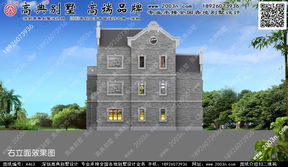A463号别墅外墙主要材料:天然岩石漆、水泥构件葫芦柱栏杆、外墙青砖、欧式石材构件线条、屋面仿石青瓦 |