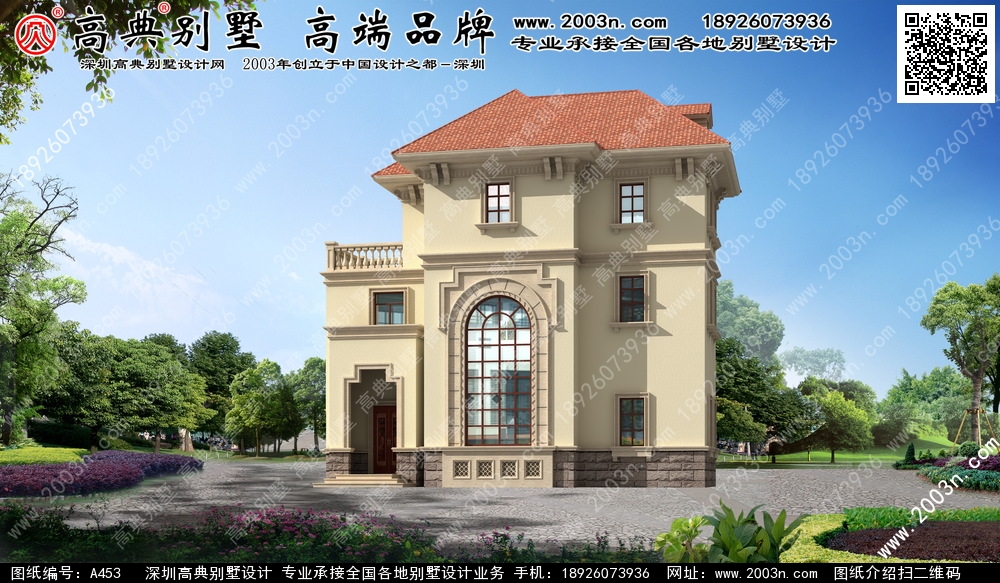 此别墅外墙主要材料:天然岩石漆、水泥构件葫芦柱栏杆、蘑菇面黄锈石、欧式石材构件线条、屋面310X310S瓦 |