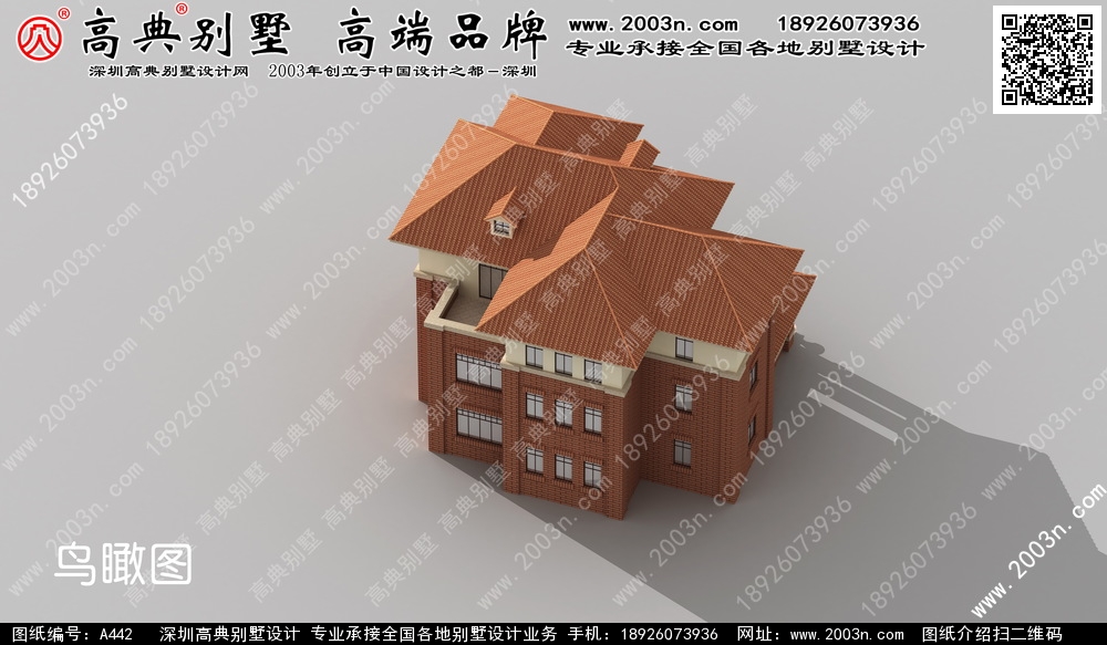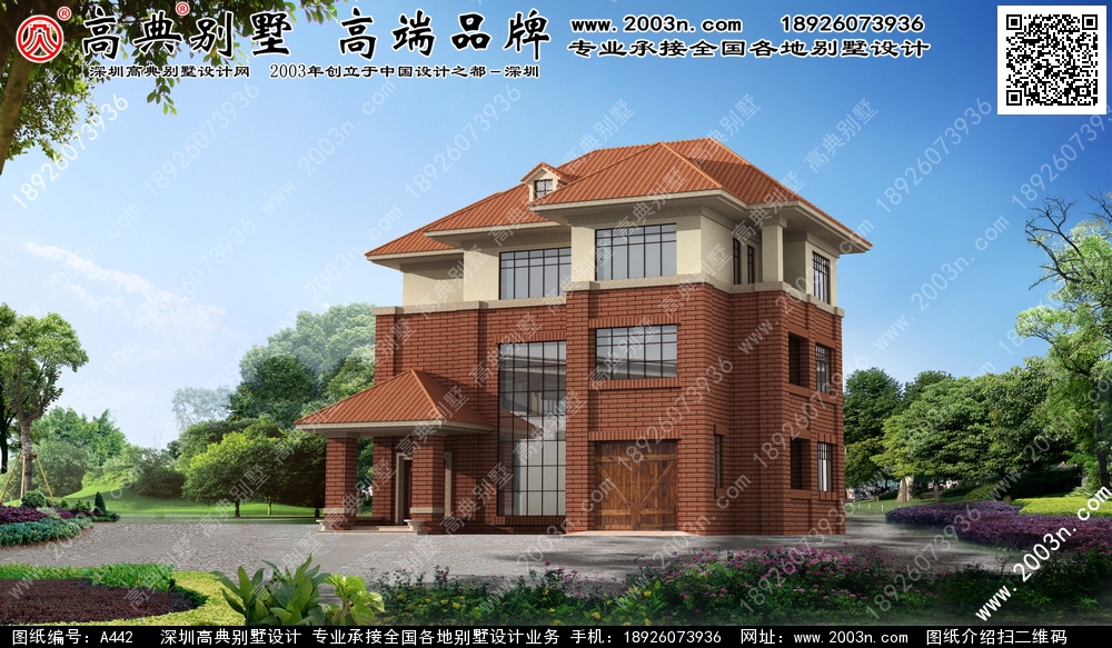 A442号别墅外墙主要材料:别墅外墙天然岩石漆、劈开砖、屋面310X310S瓦 |