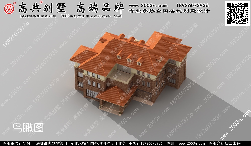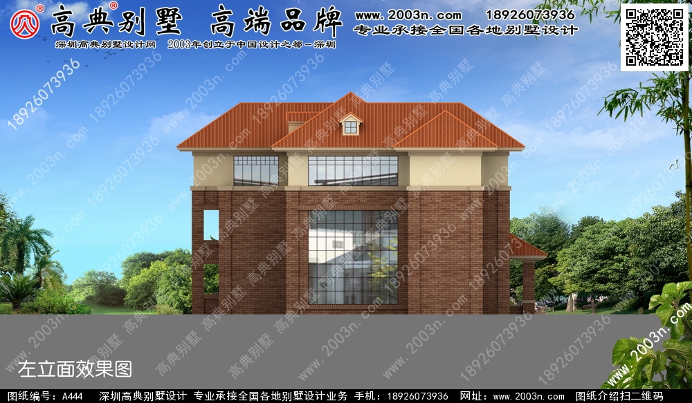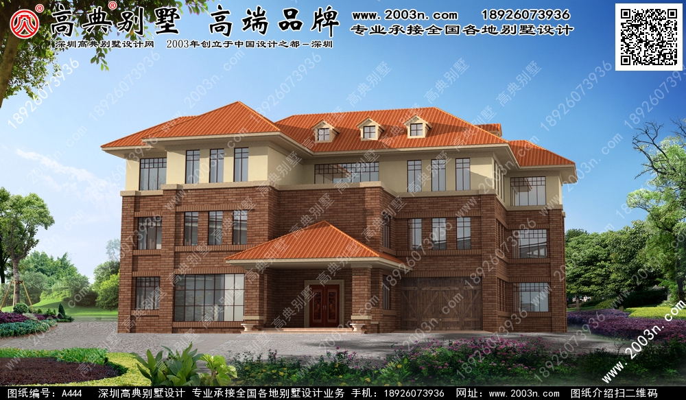 A444号别墅外墙主要材料:别墅外墙天然岩石漆、劈开砖、屋面310X310S瓦 |