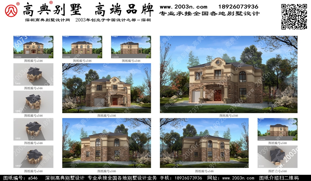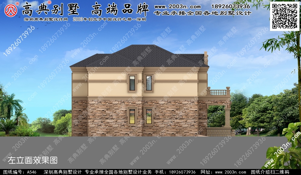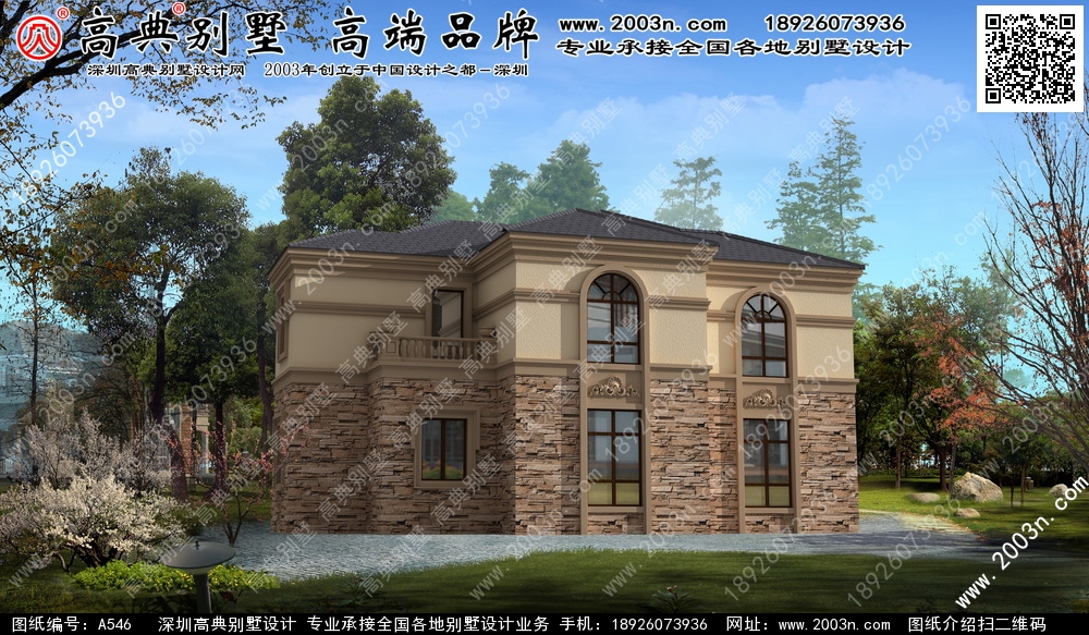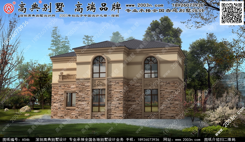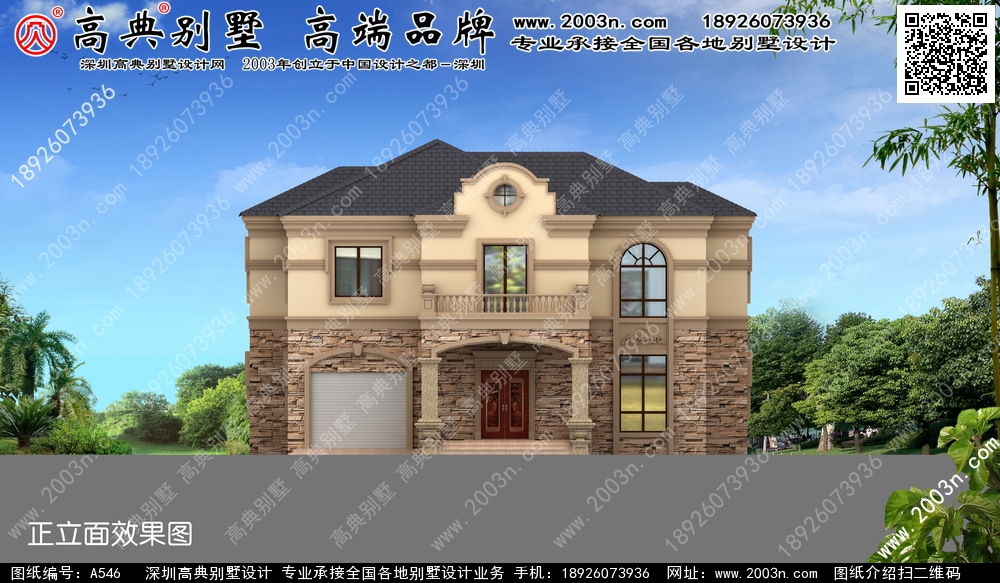 外墙天然岩石漆、欧式构件线条、文化石、屋面水泥平板瓦 |