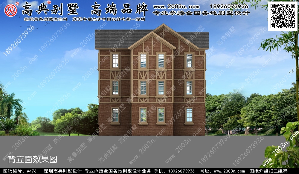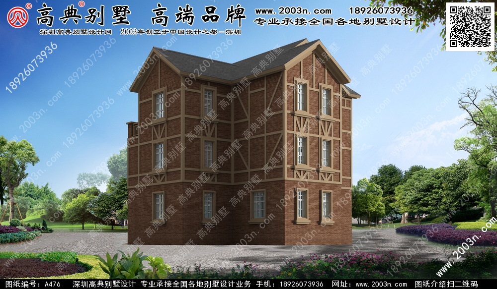 A475号别墅外墙主要材料:真石漆、水泥构件墙面装饰线条、劈开砖、铁艺栏杆、屋面水泥平板瓦 |