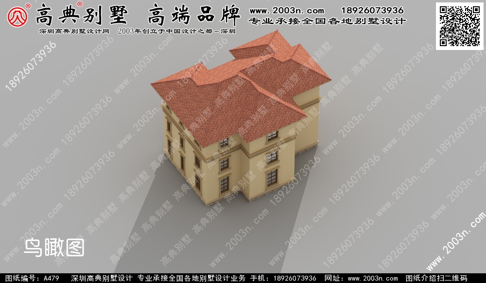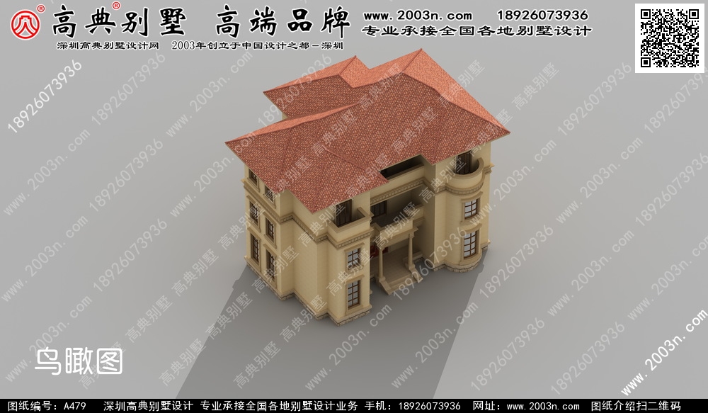 A479号别墅外墙主要材料:外墙真石漆、水泥构件墙面装饰线条、墙脚黄锈石、多色西班牙筒瓦 |