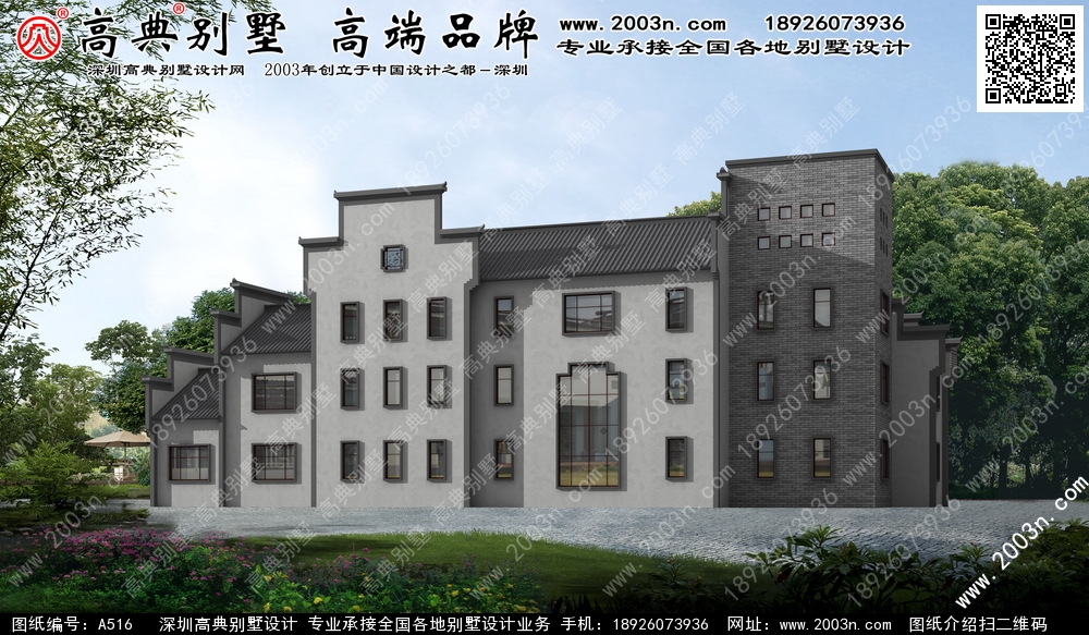 徽派三层别墅外观效果图 首层430平方米图纸编号A516