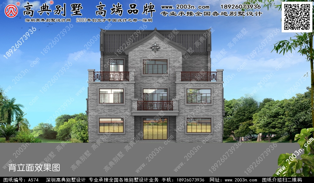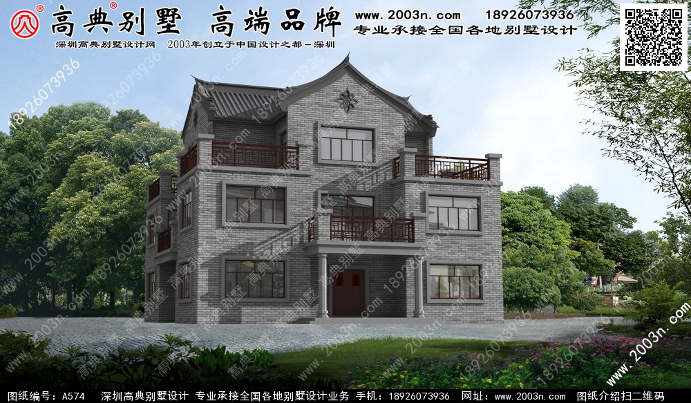 A574号别墅外墙主要材料:外墙真石漆、仿古小青砖、灰色仿石青瓦 |