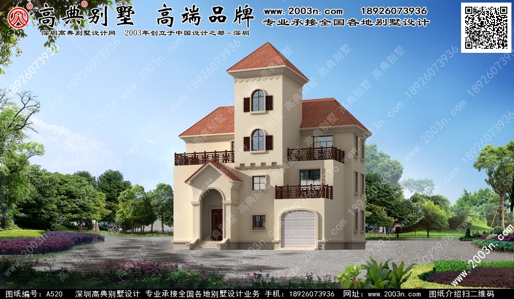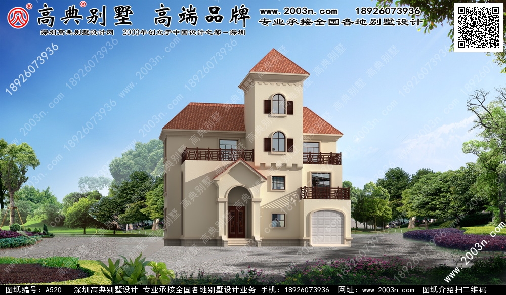 外墙真石漆、实木栏杆、荔枝面黄锈石、屋面多色西班牙瓦 |