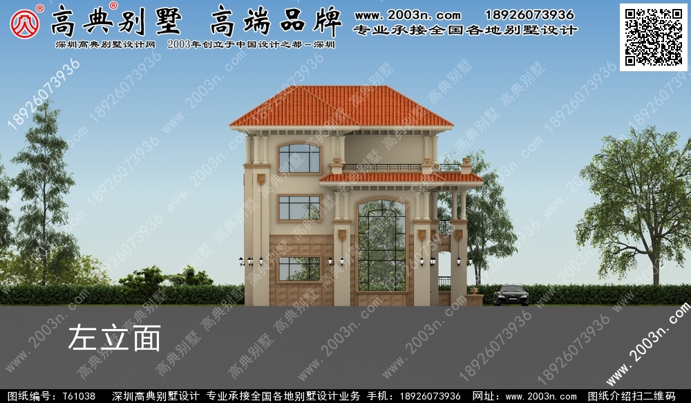 t61038号别墅外墙材料:天然岩石漆、天然砂岩石板材、天然砂岩石浮雕、310X310 S瓦、GRC水泥构件、铁艺栏杆