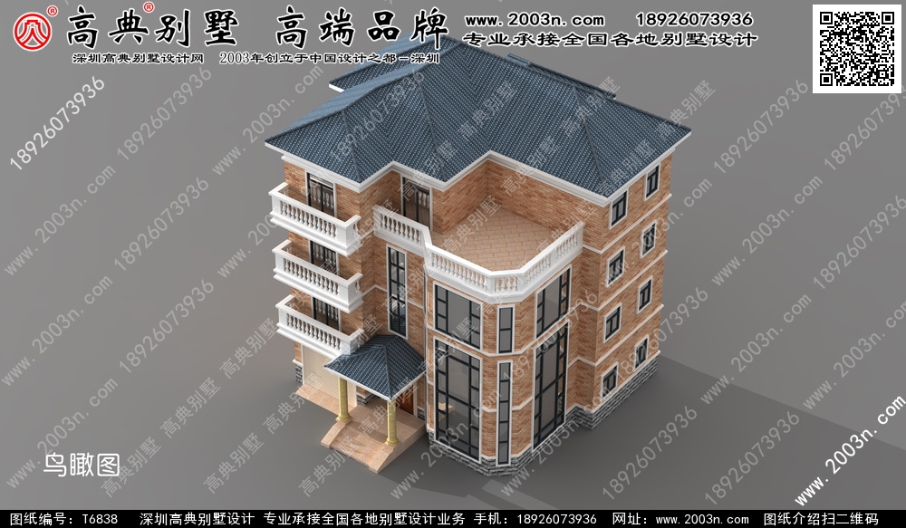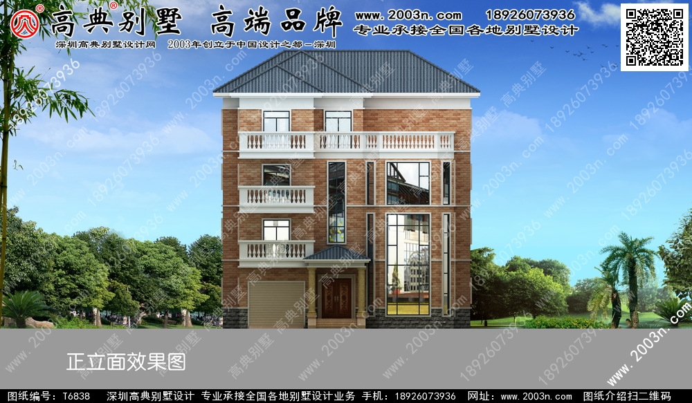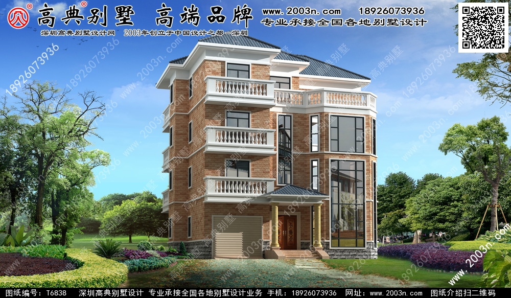 t6838号别墅外墙主要材料:外墙贴蘑菇面黄锈石、西瓦、GRC水泥葫芦柱、墙裙蘑菇面麻石、白色真石漆