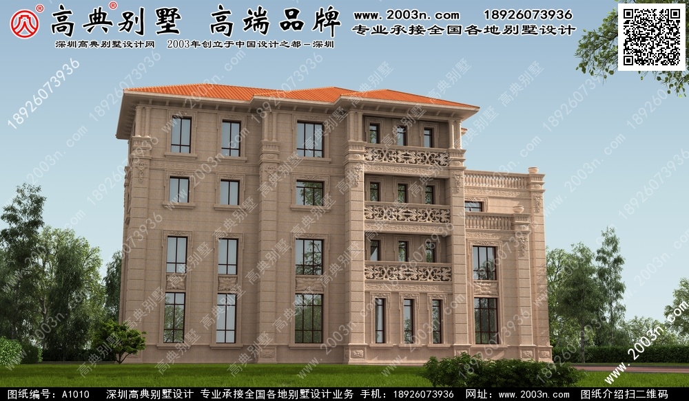 A1010号别墅外墙主要材料:外墙纯石材干挂及浮雕线条等、外墙永定红石材、屋面310X310S瓦 |