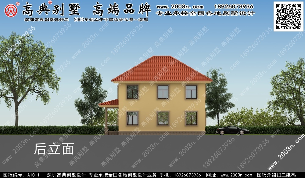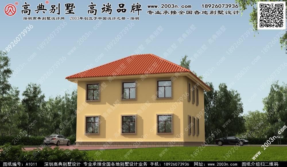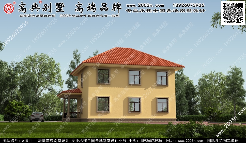 A1011号别墅外墙主要材料:墙脚荔枝面黄锈石、外墙真石漆、屋面西班牙瓦 |