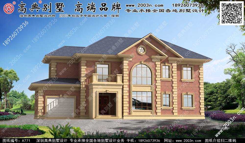 此别墅外墙主要材料:荔枝面黄锈石、铁艺栏杆、水泥平板瓦、外墙劈开砖 |