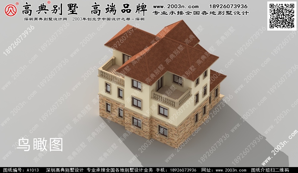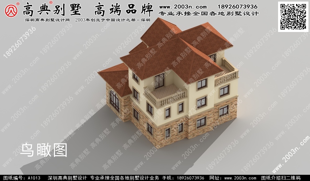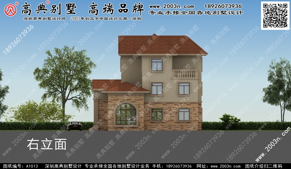 A1013号别墅外墙主要材料:外墙真石漆、外墙文化石、水泥平板瓦 |