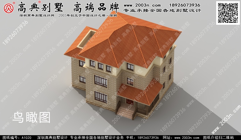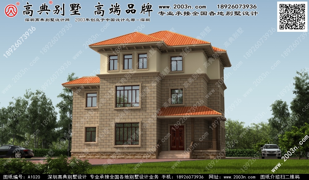 A1020号别墅外墙主要材料:外墙真石漆、310X310S瓦、荔枝面黄锈石 |