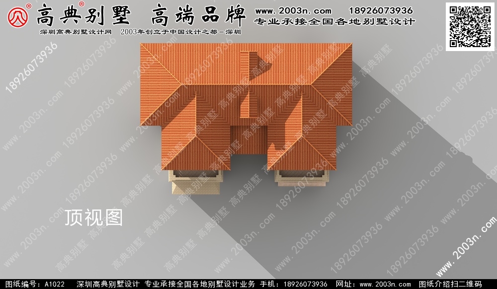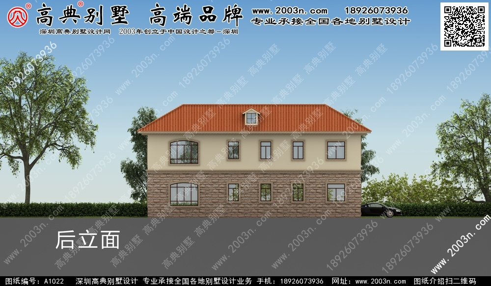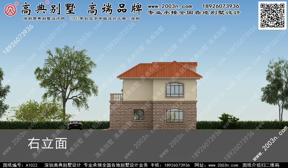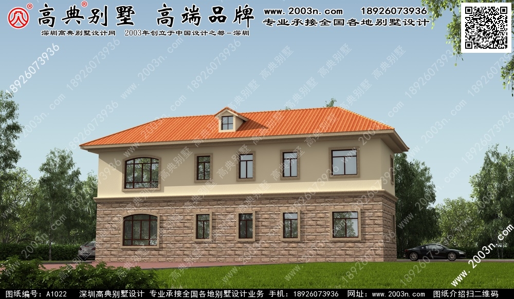 A1022号别墅外墙主要材料:外墙真石漆、蘑菇面黄锈石、屋面310X310S瓦 |