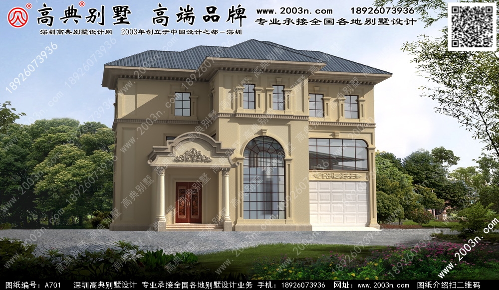 此别墅外墙主要材料:天然岩石漆、荔枝面黄锈石墙脚、欧式构件线条、屋面310X310S瓦 |