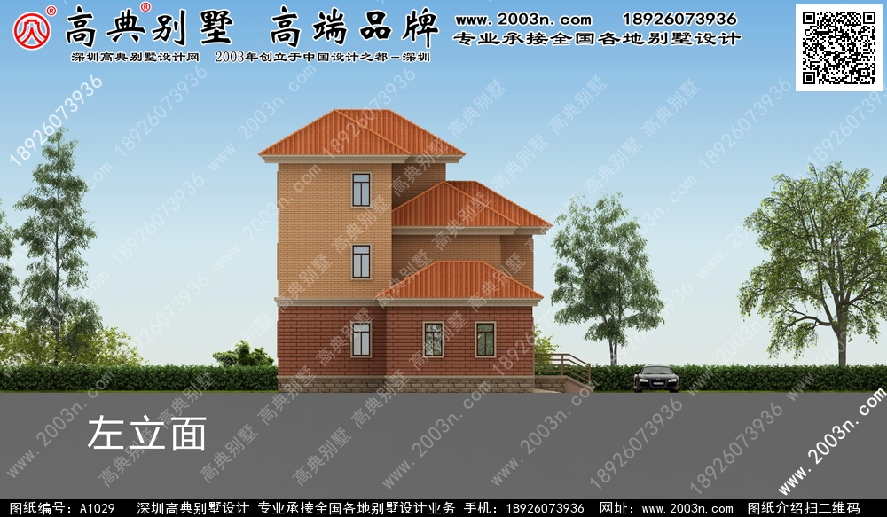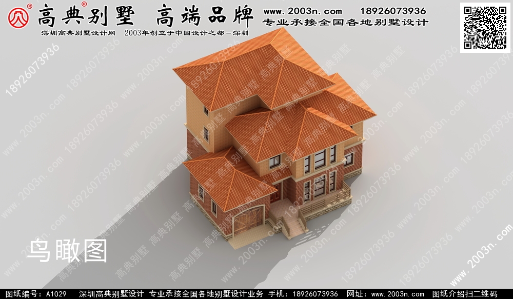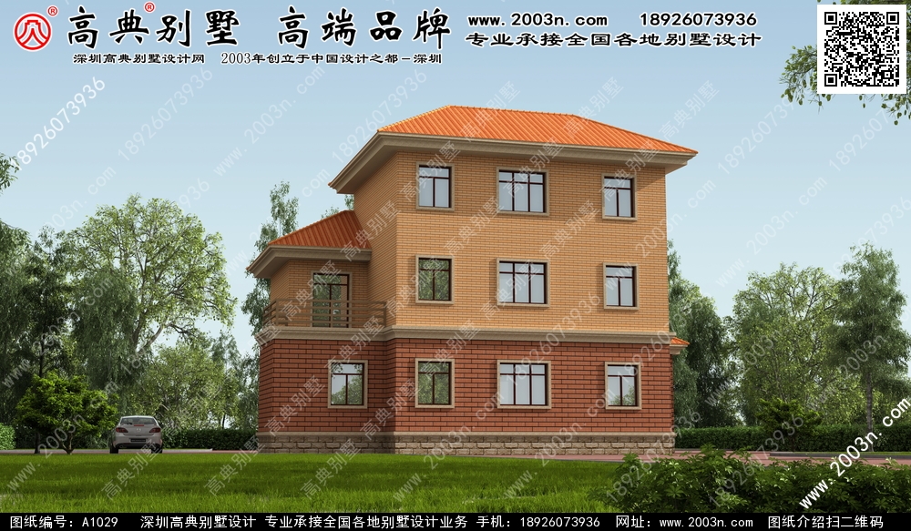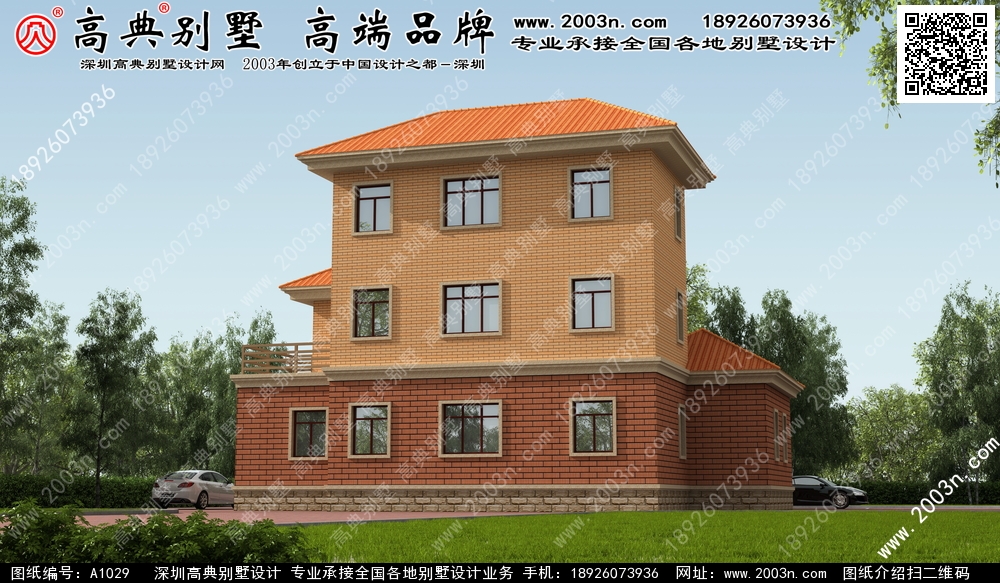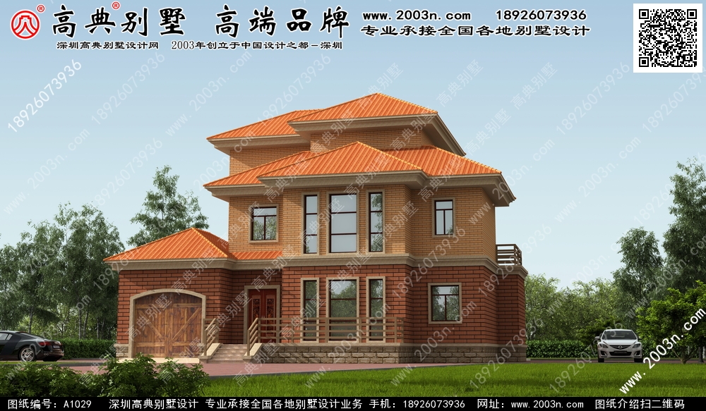 A1029号别墅外墙主要材料:线条及屋檐真石漆、屋面310X310S瓦、铁艺栏杆、劈开砖、墙脚蘑菇面黄锈石 |