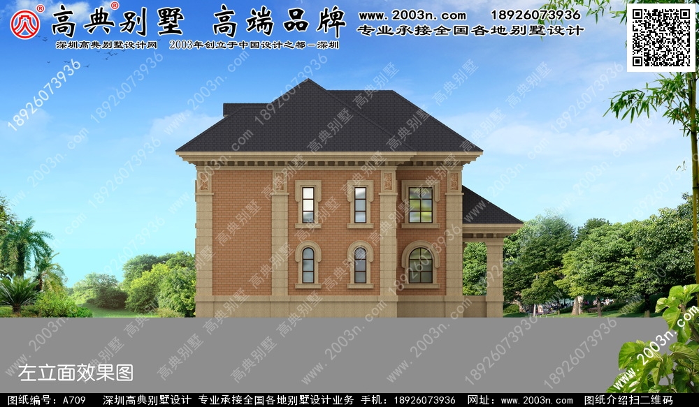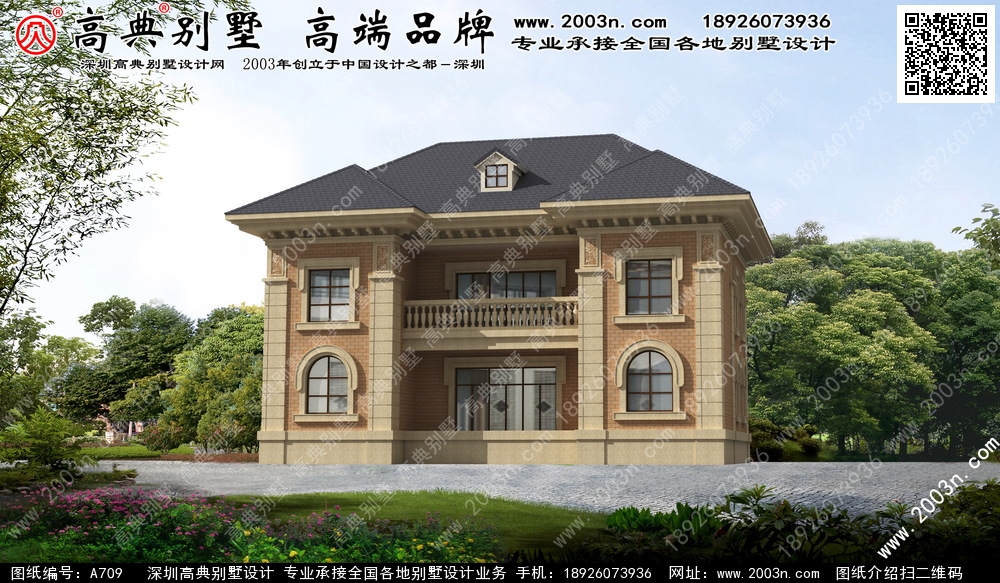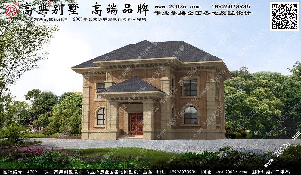 此别墅外墙主要材料:天然岩石漆、水泥构件葫芦柱栏杆、荔枝面黄锈石、外墙劈开砖、欧式构件线条、屋面水泥平板瓦 |