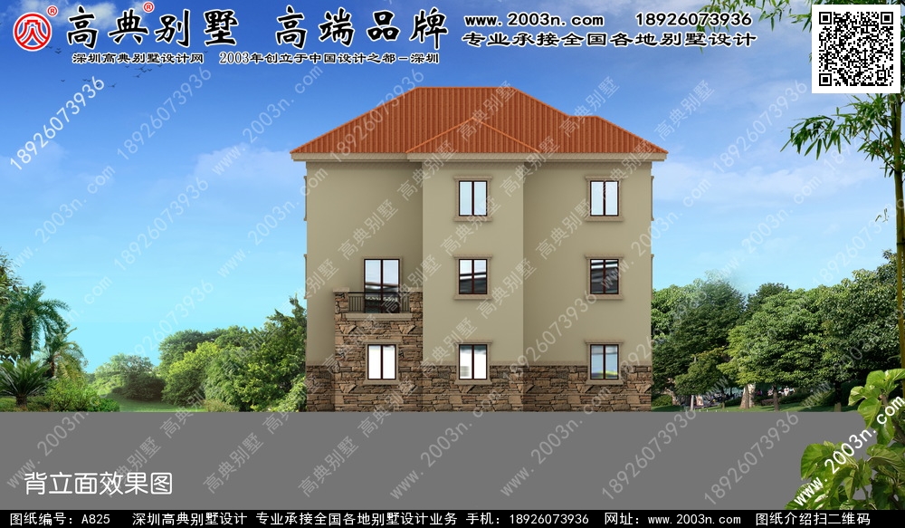 a825号别墅外墙主要材料:外墙文化石、铁艺栏杆、天然岩石漆、水泥构件线条、屋面310X310S瓦 |