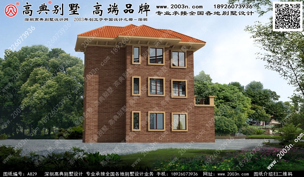 a829号别墅外墙主要材料:外墙劈开砖、蘑菇面黄锈石、铁艺栏杆、天然岩石漆、屋面310X310S瓦 |