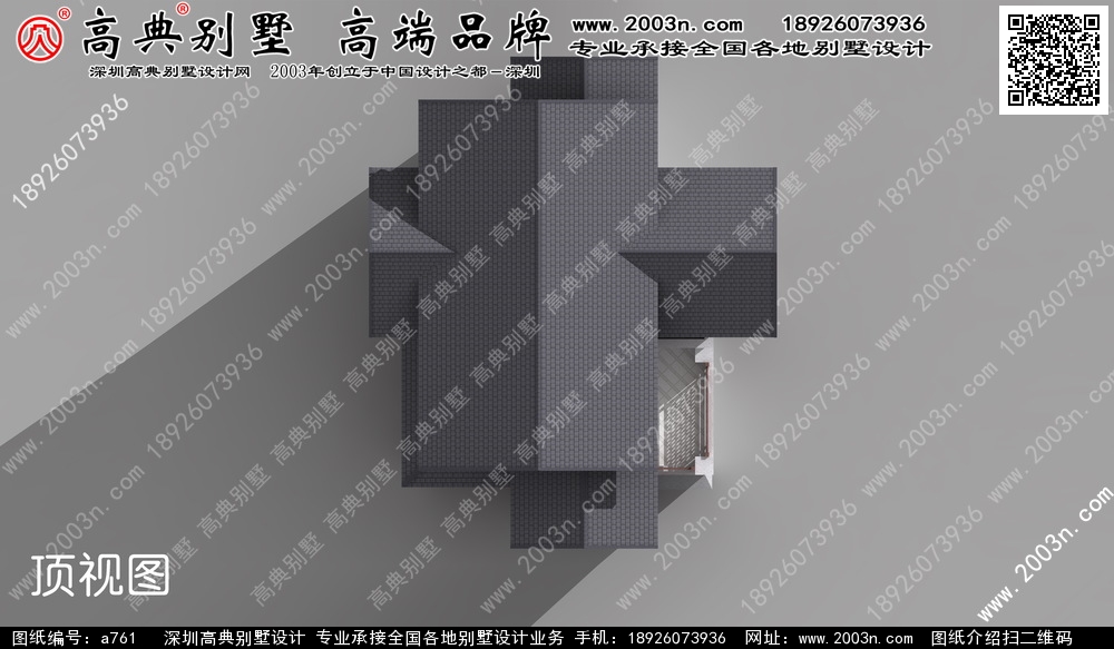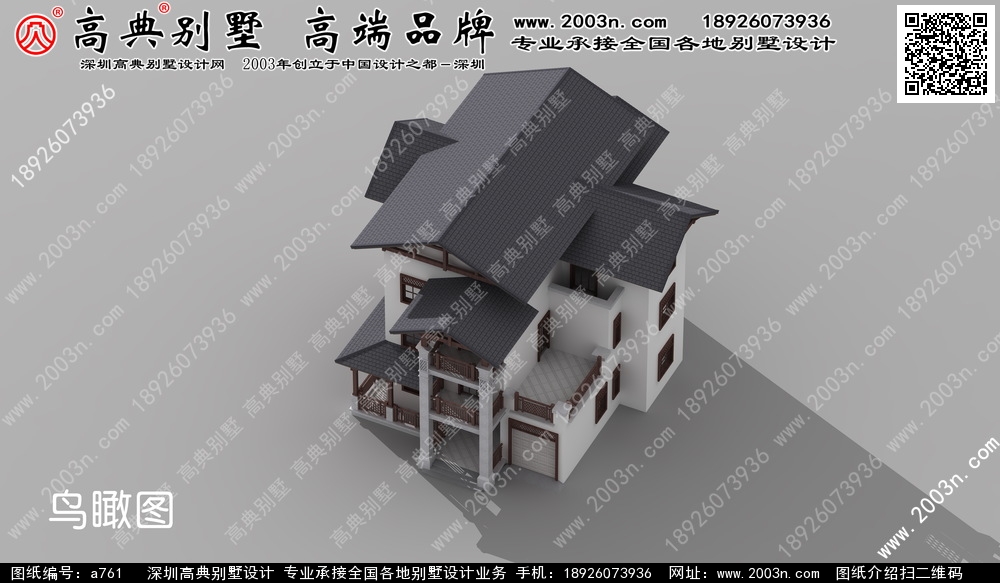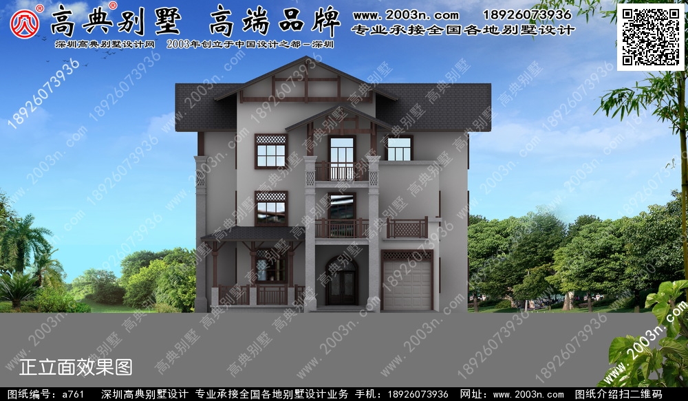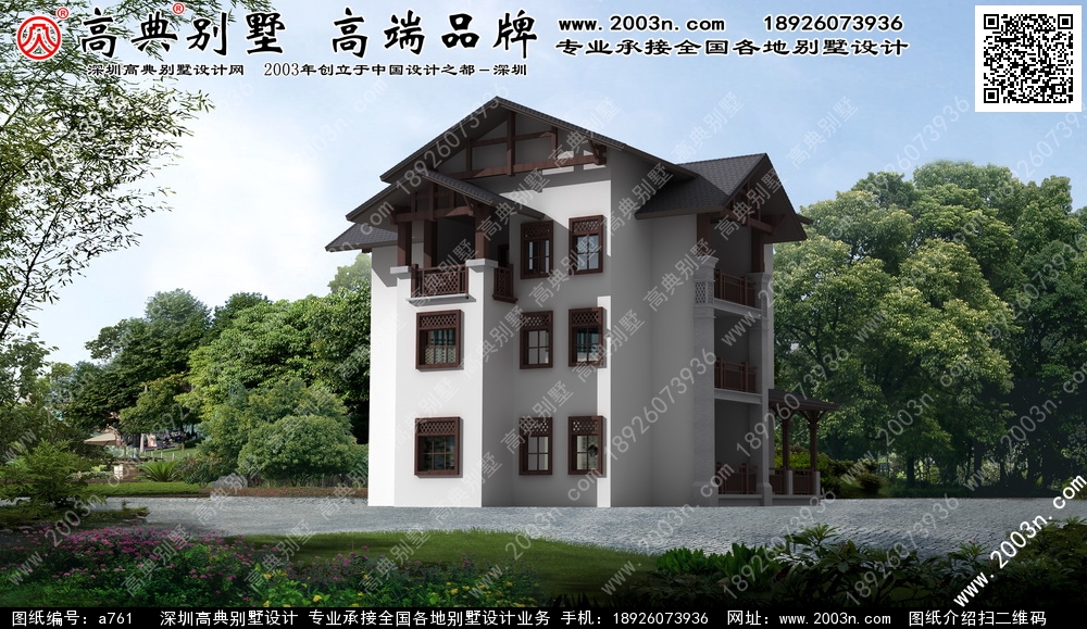 A761号别墅外墙主要材料:外墙真石漆、实木栏杆、屋面水泥平板瓦 |