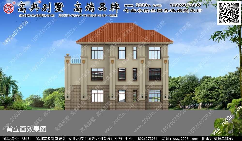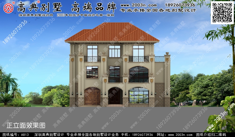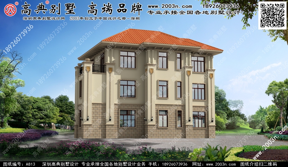 a813号别墅外墙主要材料:荔枝面黄锈石、铁栏杆、外墙真石漆、欧式构件线条、屋面310X310S瓦 |