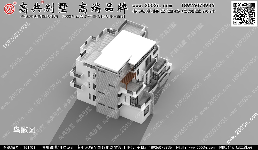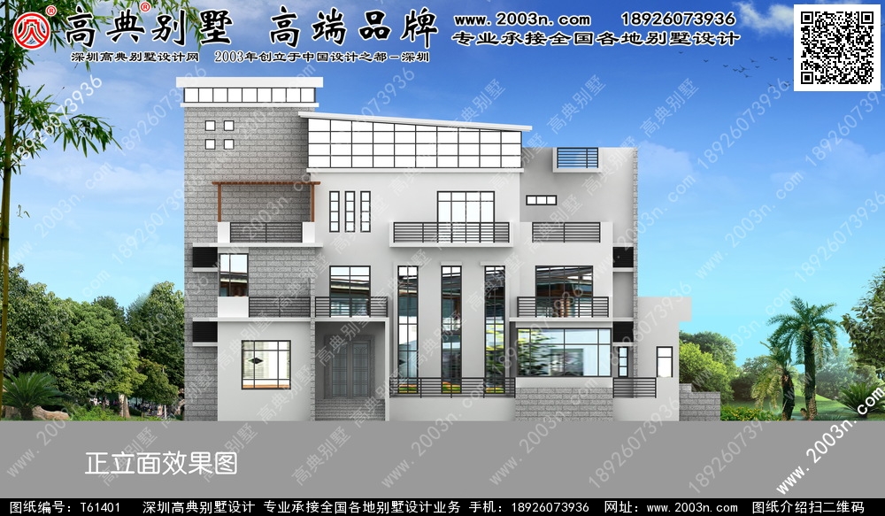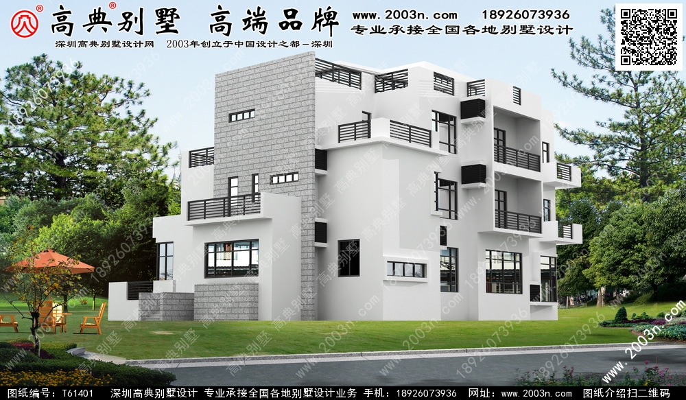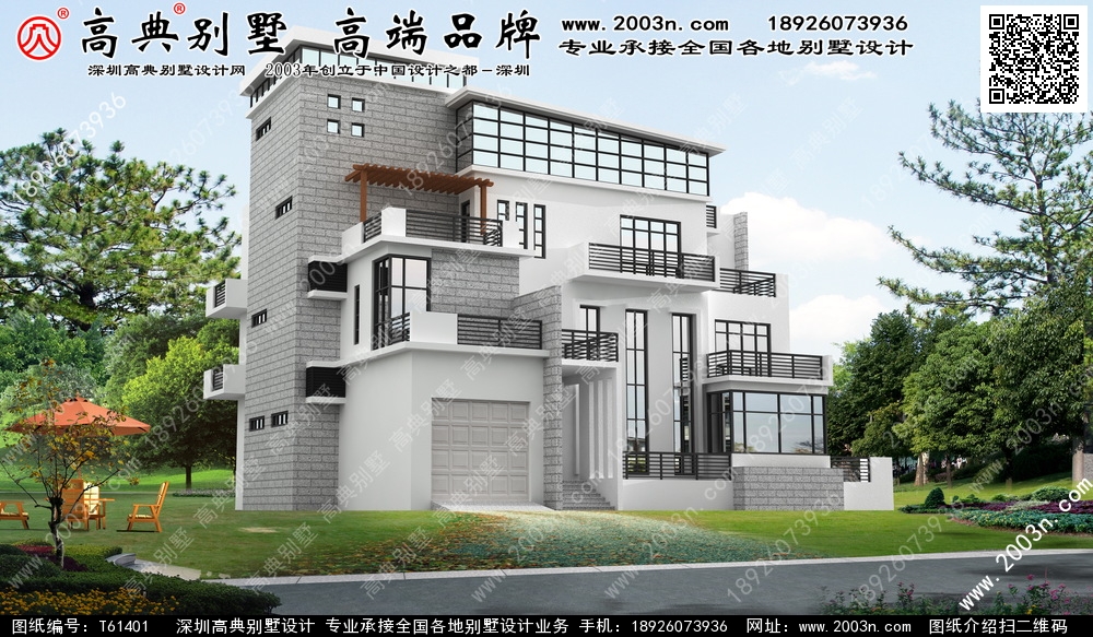 t61401号别墅外墙主要材料:天然岩石漆、荔枝面白麻石板材、铁艺栏杆