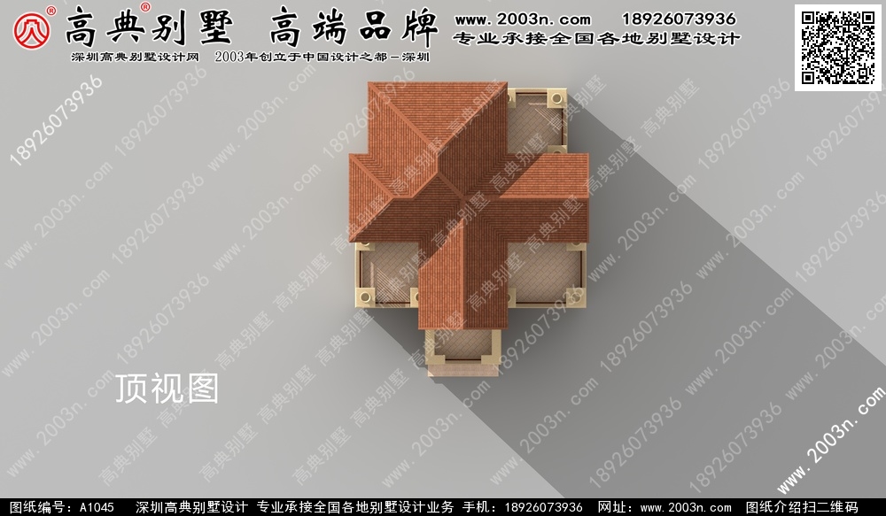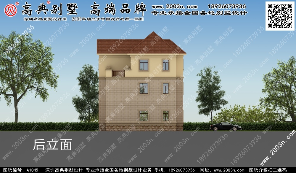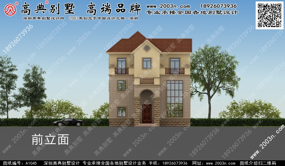 A1045号别墅外墙主要材料:真石漆、水泥平板瓦、蘑菇面黄锈石、外墙砖、铁艺栏杆,水泥构件 |