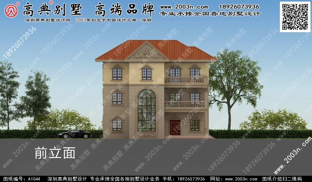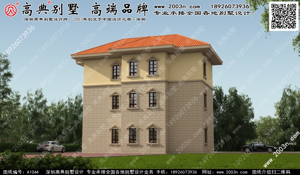 A1044号别墅外墙主要材料:真石漆、310X310S瓦、外墙砖、水泥构件、葫芦柱栏杆 |