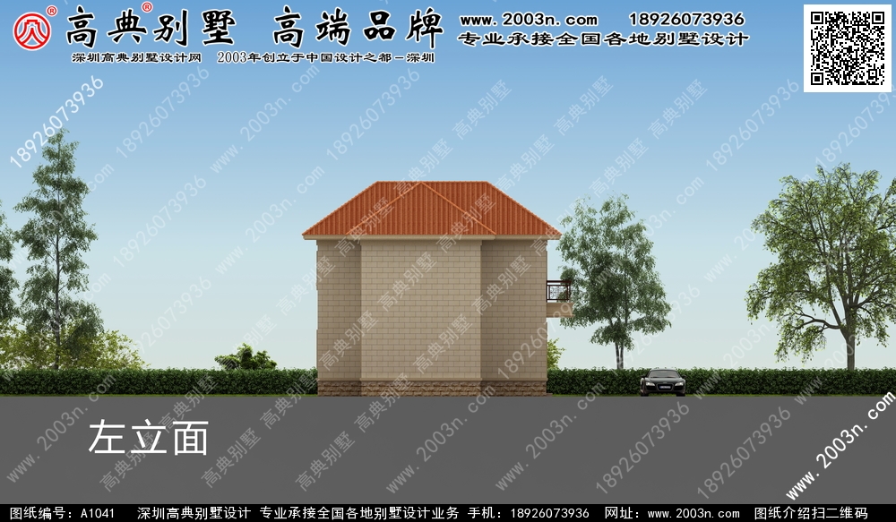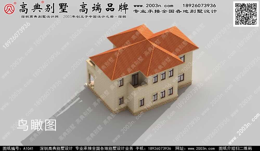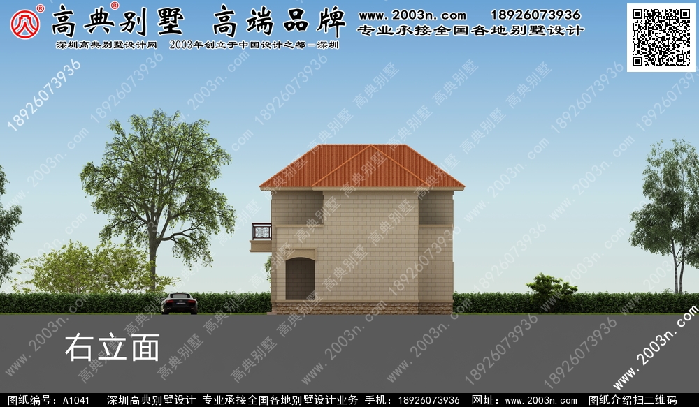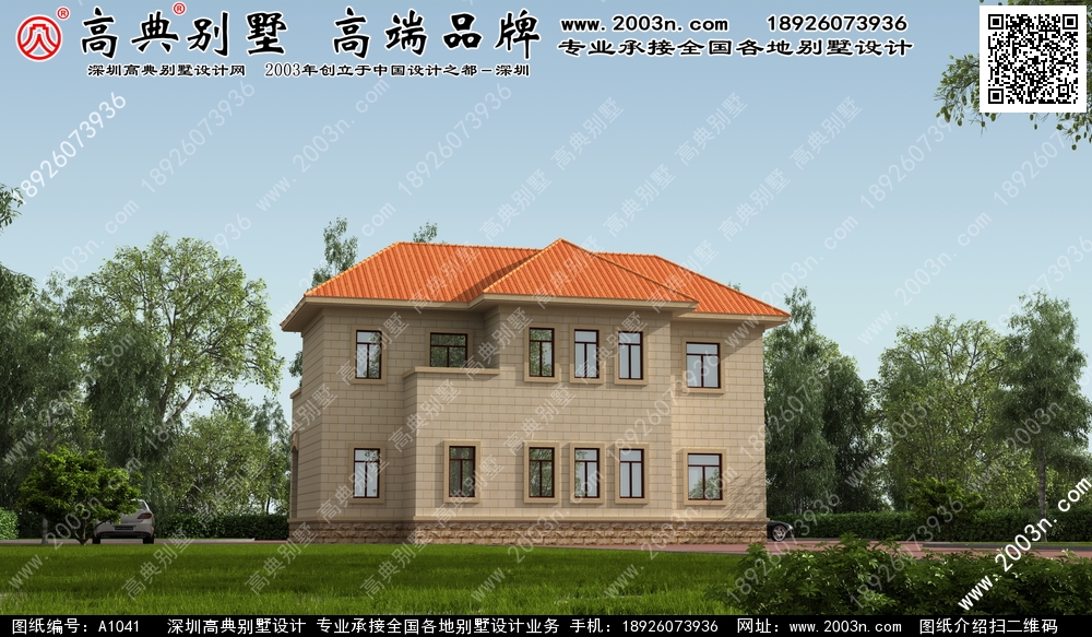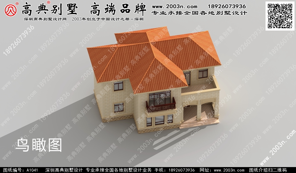 A1041号别墅外墙主要材料:真石漆、310X310S瓦、外墙砖、蘑菇面黄锈石、水泥构件 |
