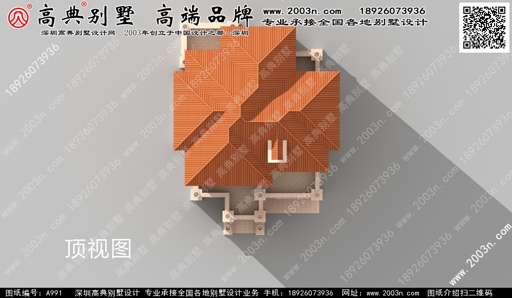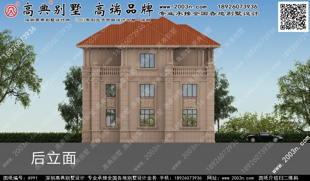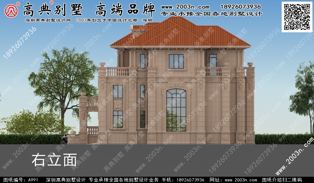 a991号别墅外墙主要材料:荔枝面永定红纯石材干挂、屋面310X310S瓦