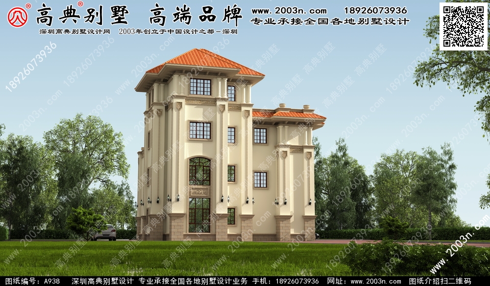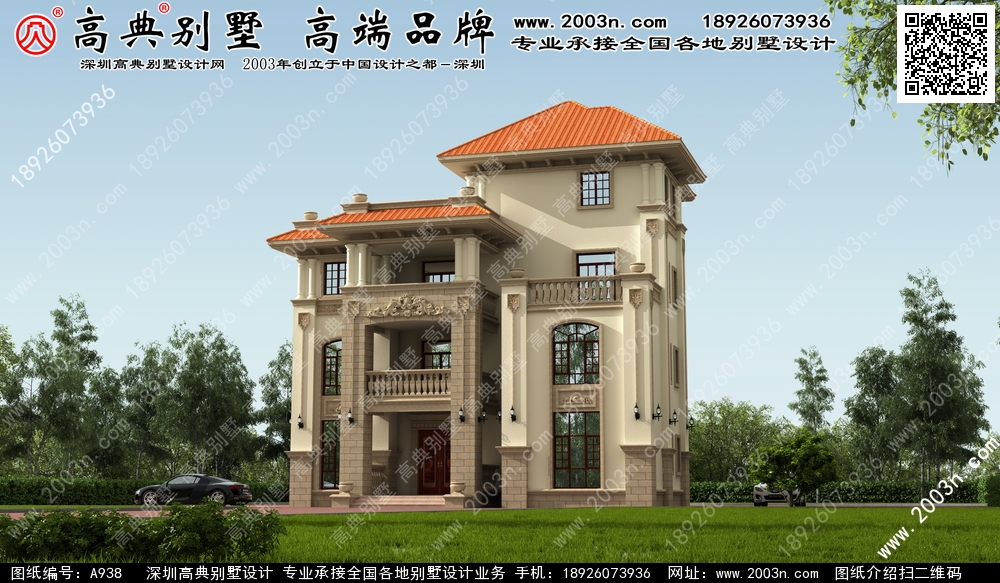 此别墅外墙主要材料:火烧面黄锈石、真石漆、欧式水泥构件圆柱线条浮雕造型、310X310S瓦 |