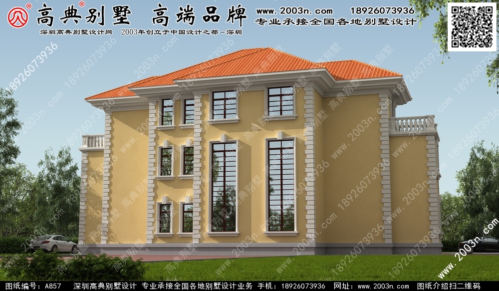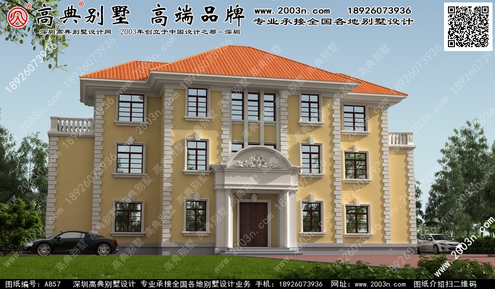 此别墅外墙主要材料:真石漆、310X310S瓦、欧式水泥构件线条造型 |