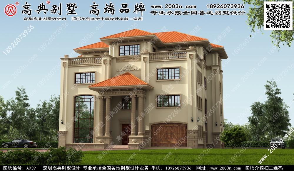此别墅外墙主要材料:火烧面黄锈石、真石漆、欧式水泥构件圆柱线条浮雕造型、310X310S瓦 |