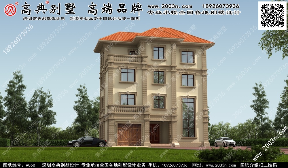 A858别墅外墙主要材料:真石漆、310X310S瓦、欧式水泥构件线条造型 |