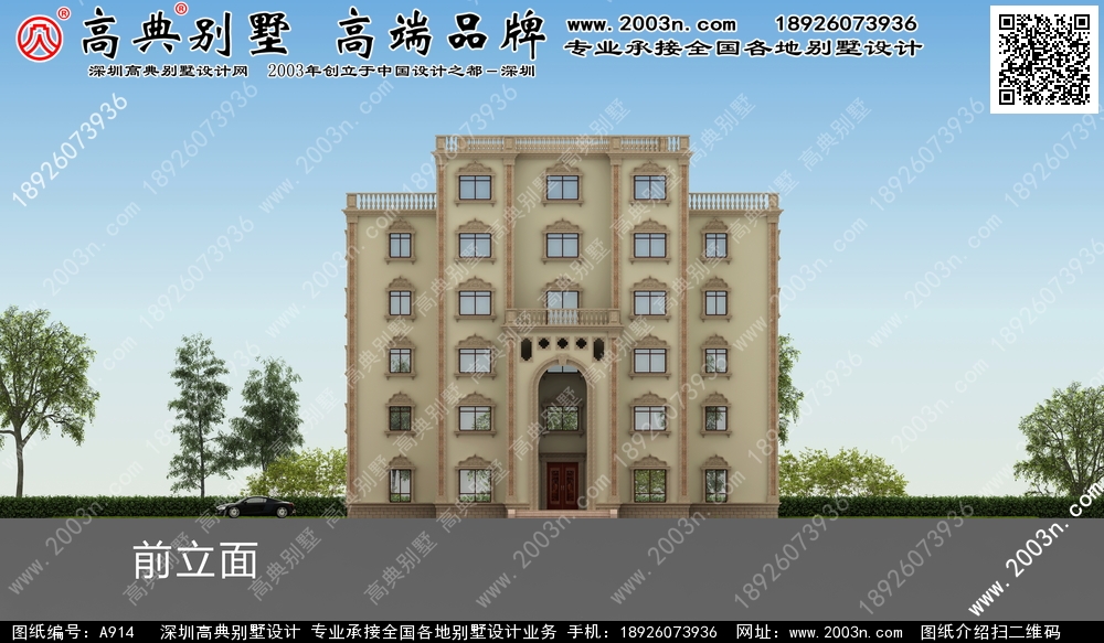 此别墅外墙主要材料:蘑菇面黄锈石墙脚、真石漆、欧式水泥构件线条浮雕造型 |