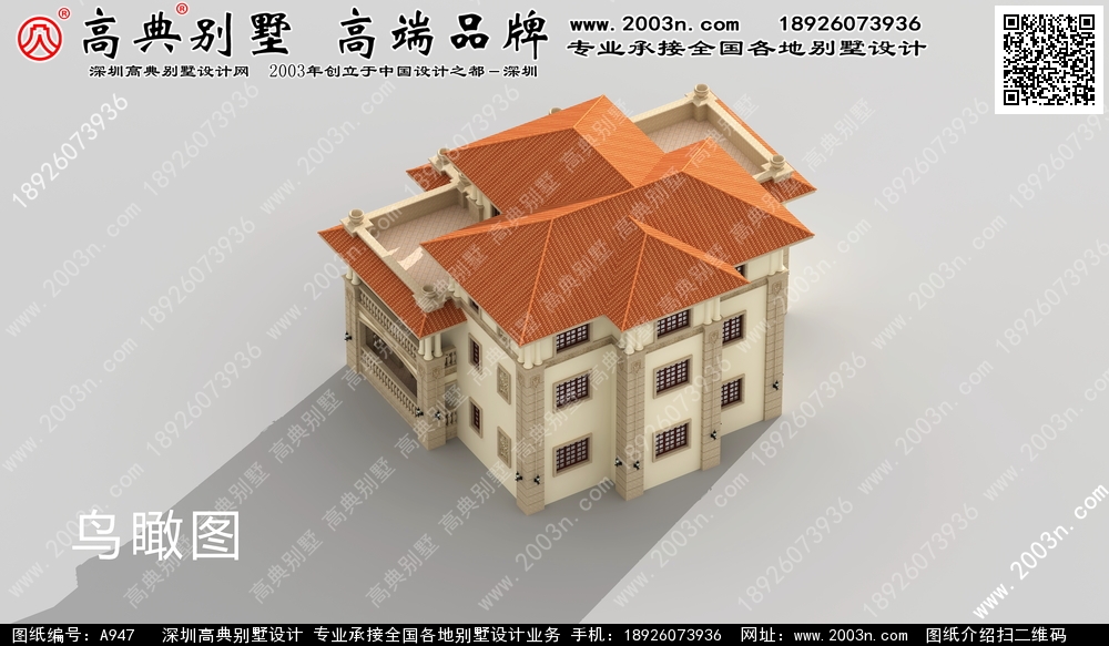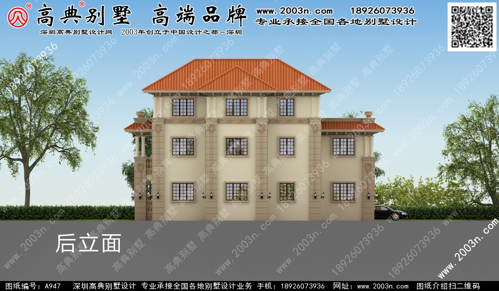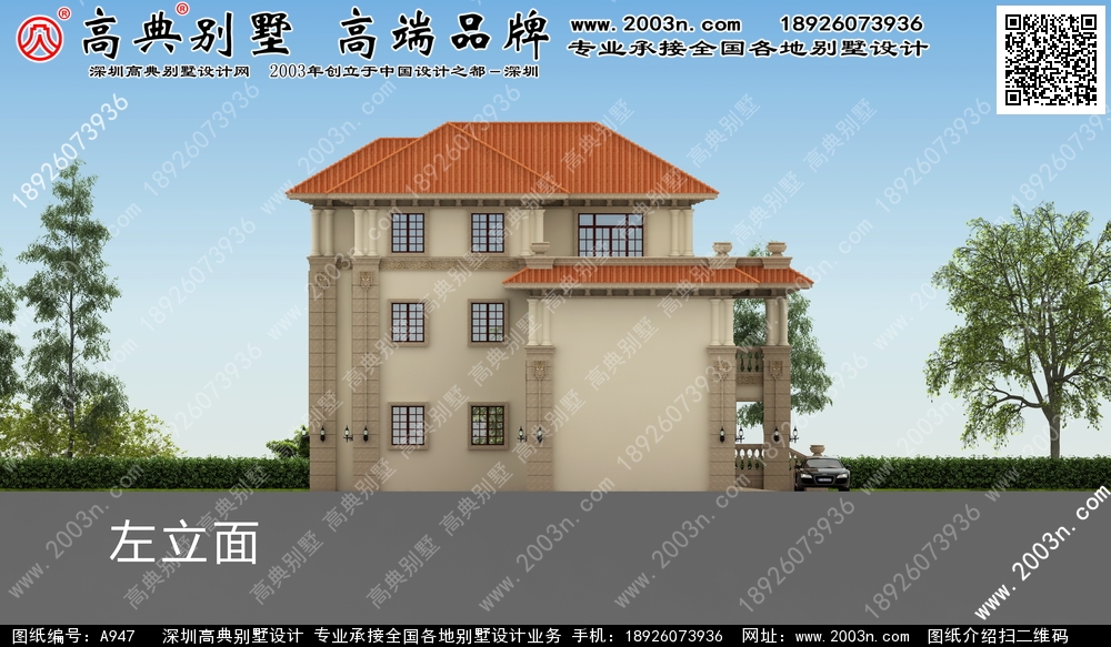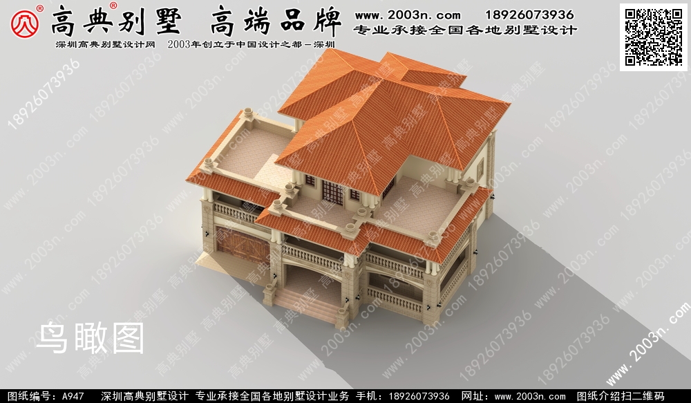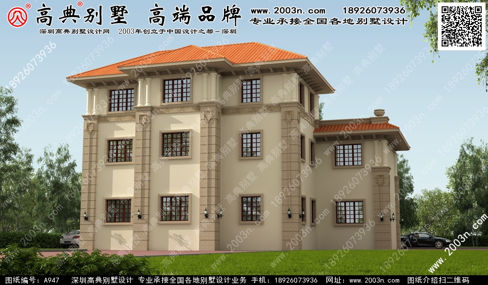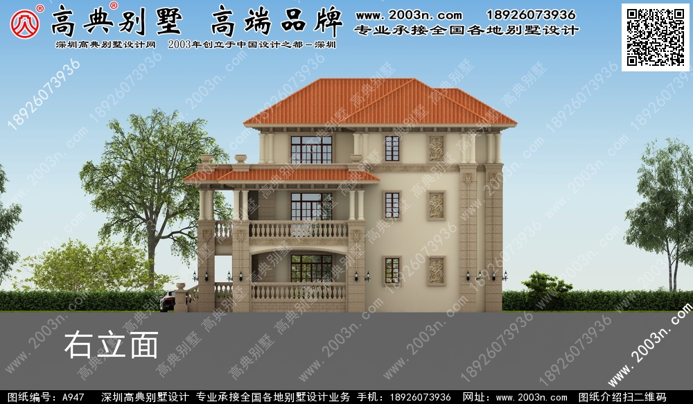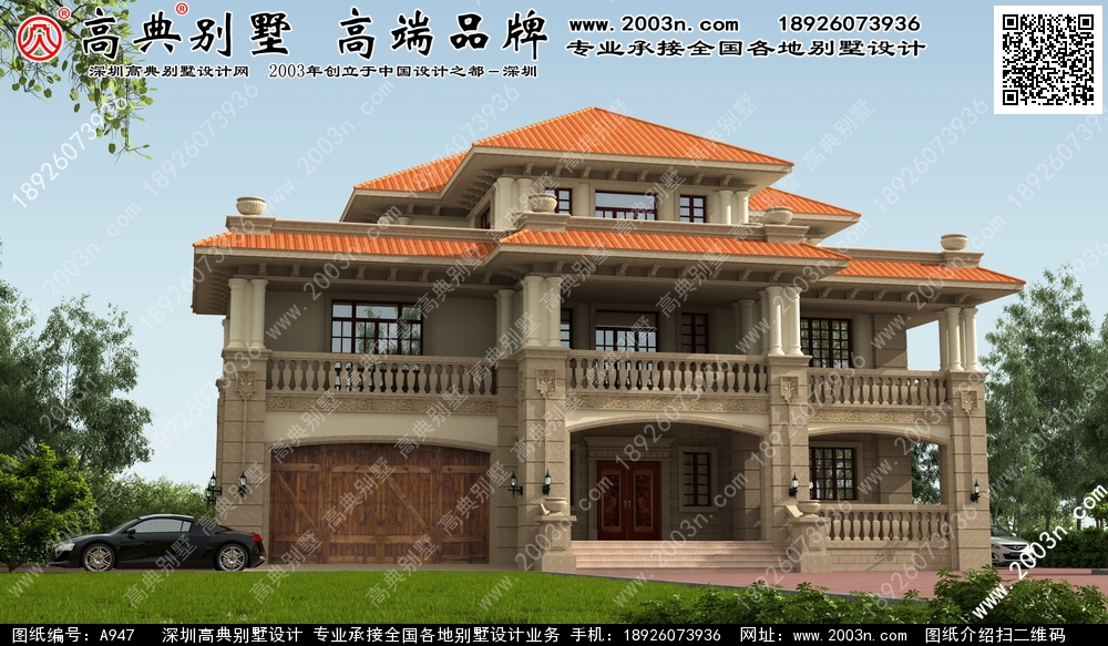 A947号别墅外墙主要材料:真石漆、310X310S瓦、面贴荔枝面黄锈石、外墙砖、葫芦柱栏杆、水泥构件