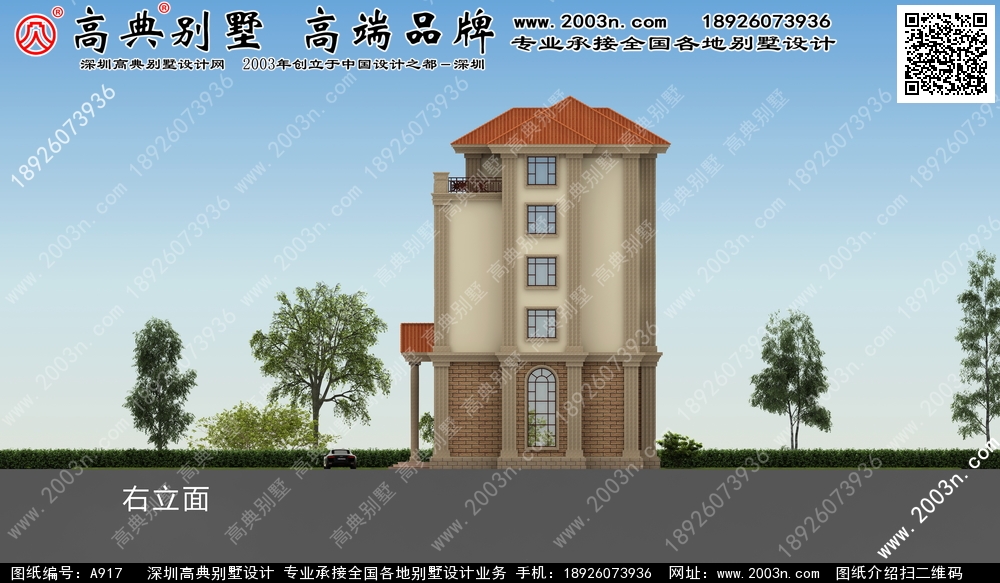 此别墅外墙主要材料:劈开砖、火烧面黄锈石墙脚、欧式水泥构件线条浮雕造型、天然岩石漆、310X310S瓦 |
