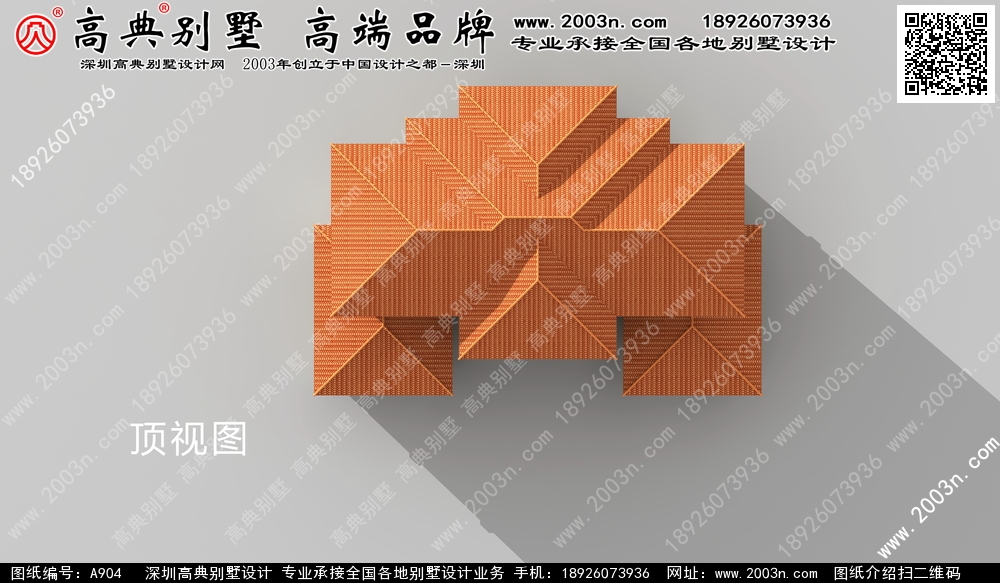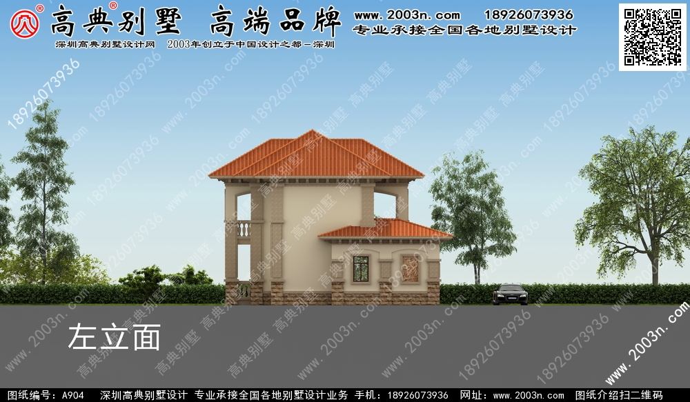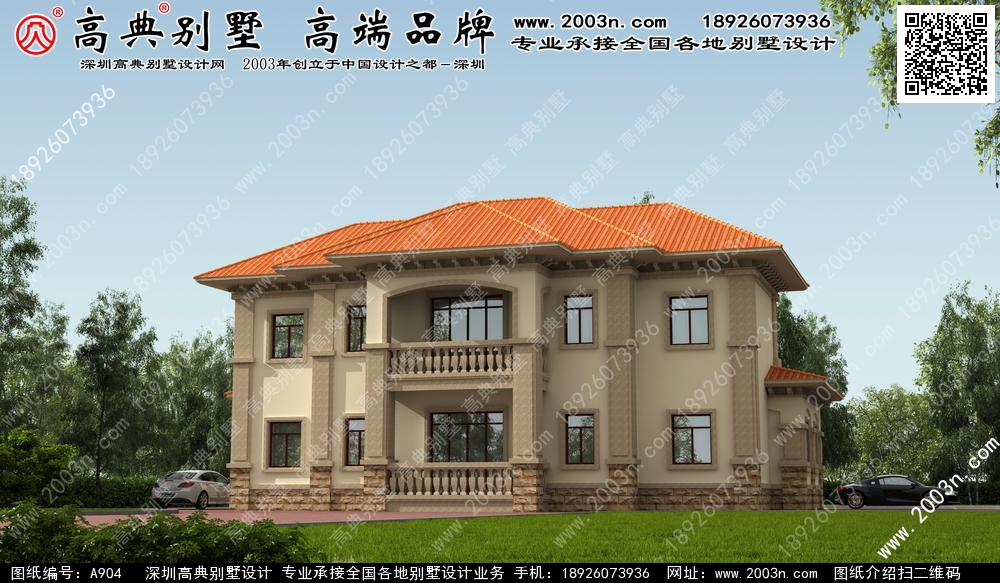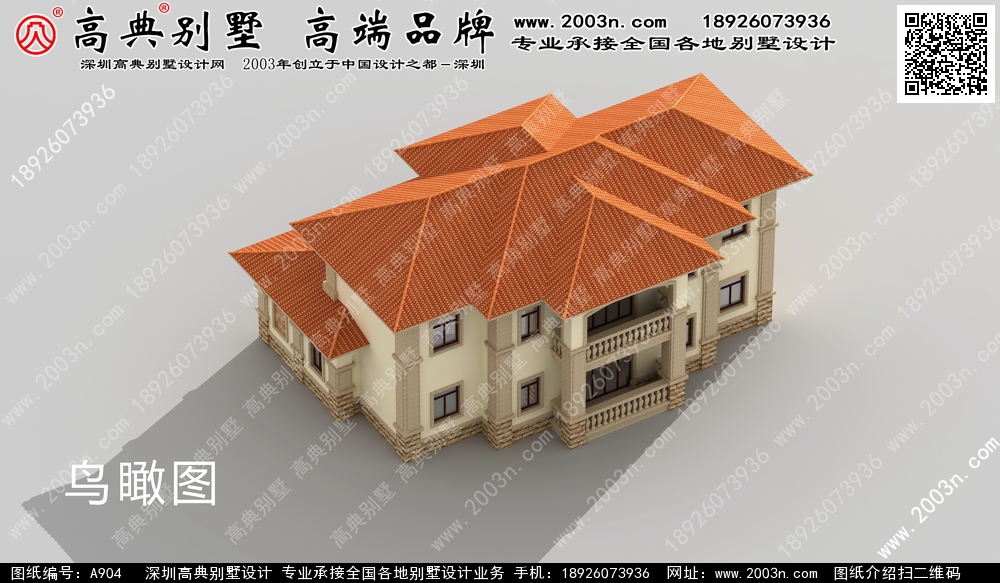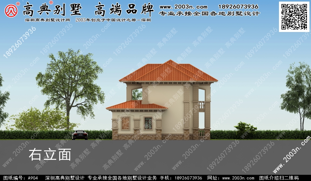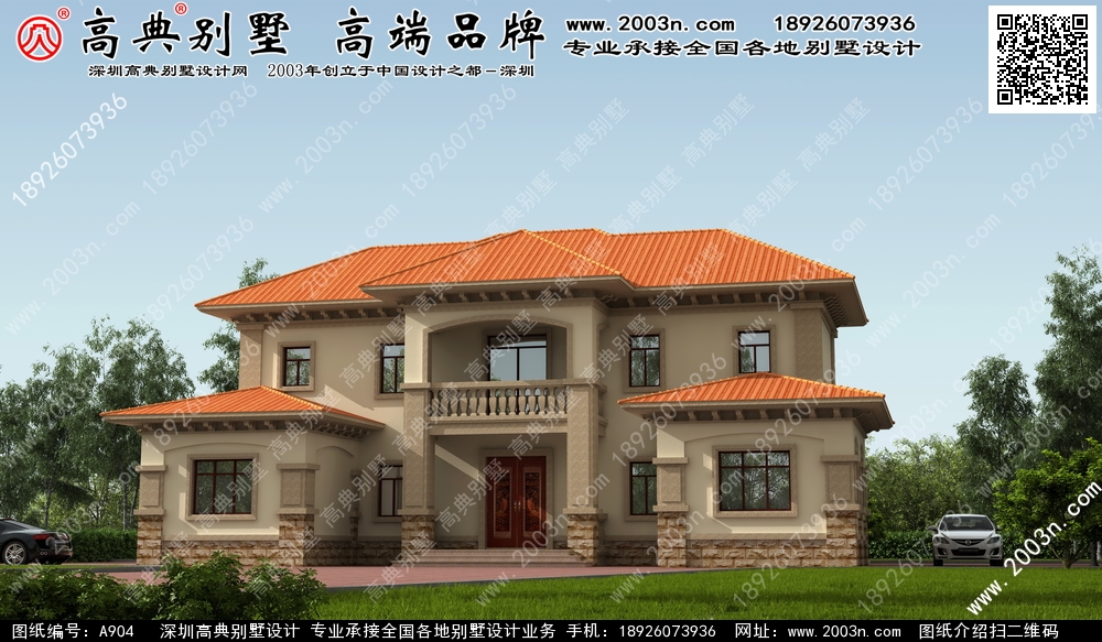 A904号别墅外墙主要材料:真石漆、310X310S瓦、蘑菇面黄锈石、黄锈石、葫芦栏杆、水泥构件斗拱