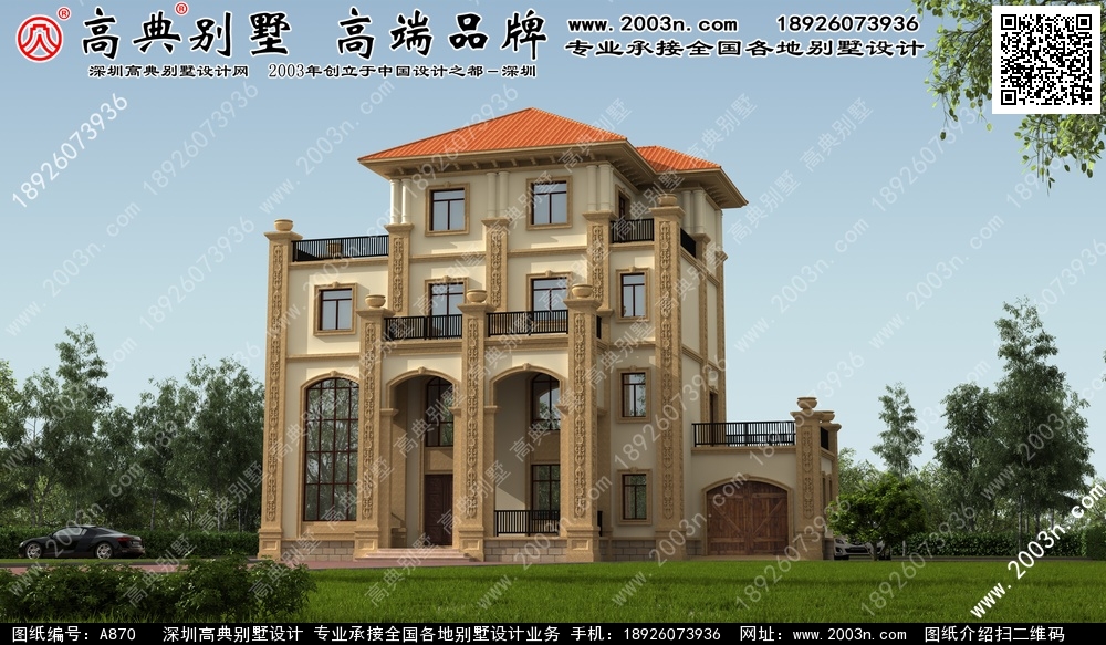 真石漆、310X310S瓦、铁艺栏杆、火烧面黄锈石、欧式水泥构件圆柱线条浮雕造型 |