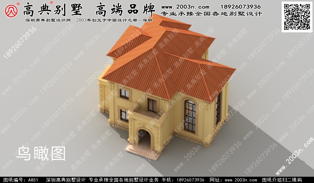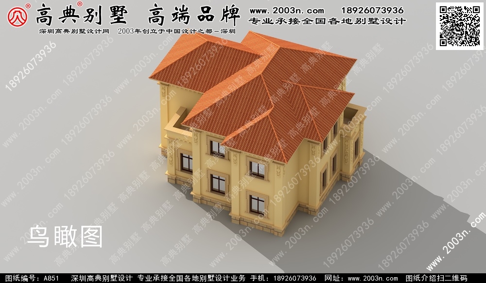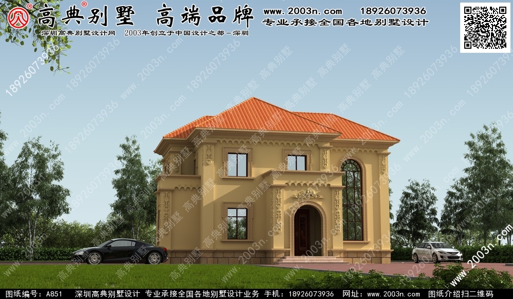 此别墅外墙主要材料:火烧面黄锈石墙脚、欧式水泥构件线条浮雕、真石漆、S瓦 |