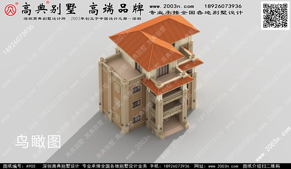 A905号别墅外墙主要材料:真石漆、310X310S瓦、蘑菇面黄锈石、水泥构件斗拱、成品浮雕、外墙砖