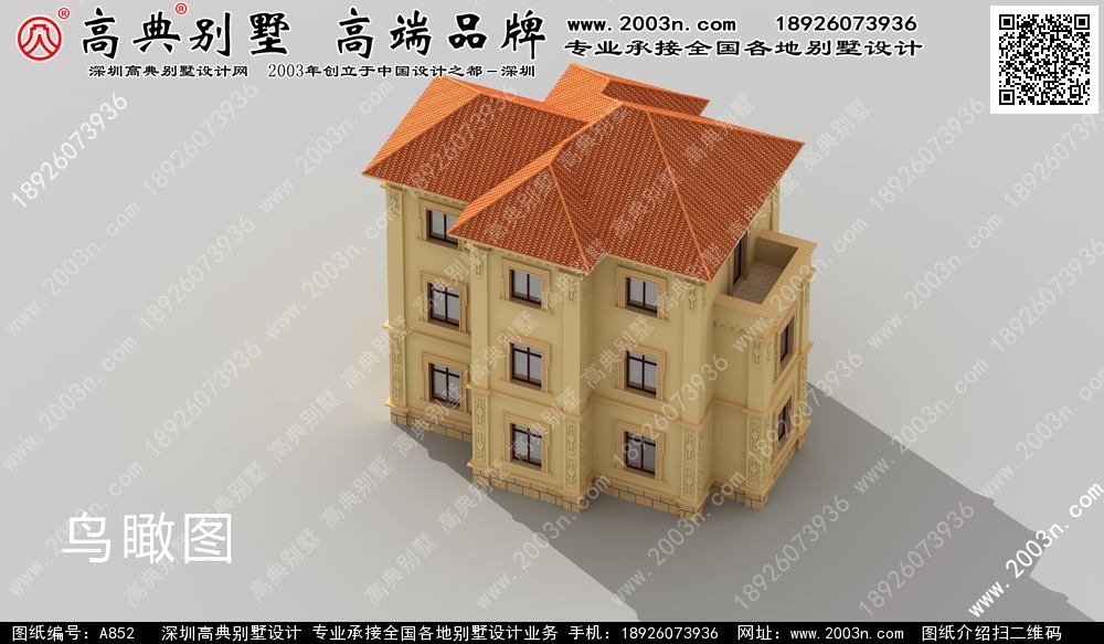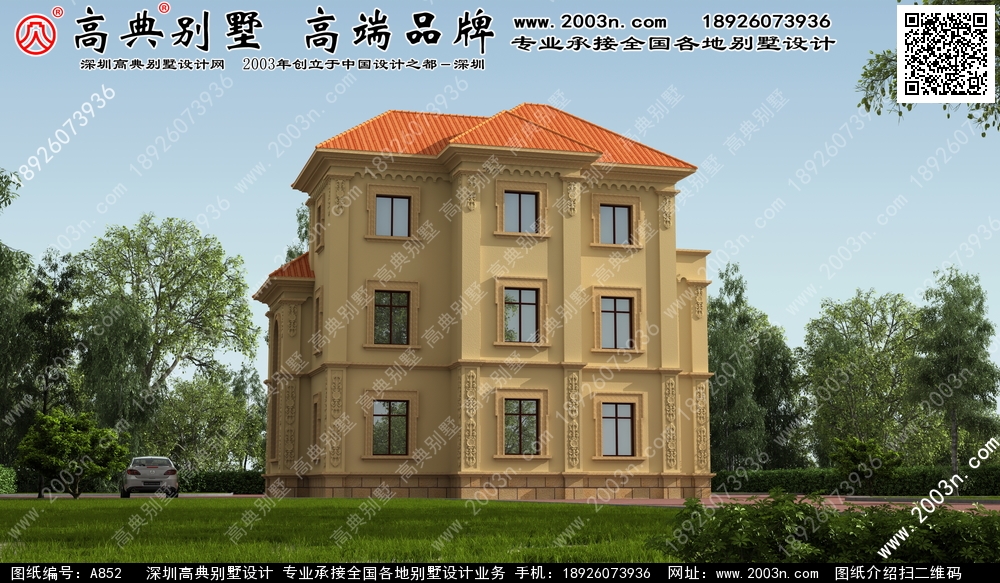 此别墅外墙主要材料:火烧面黄锈石墙脚、欧式水泥构件线条浮雕、真石漆、S瓦 |
